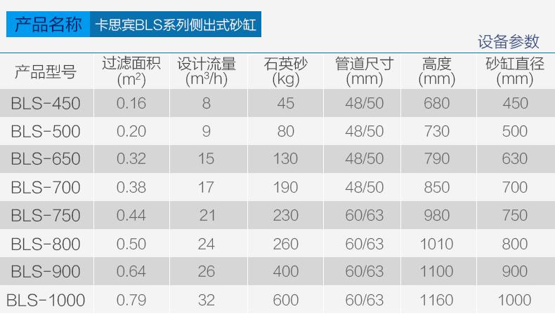 BLS-450 (filtering flow: 8m? /h), BLS-500 (filtering flow: 11.5m? /h), BLS-650 (filtering flow: 16.6m? /h), BL...
