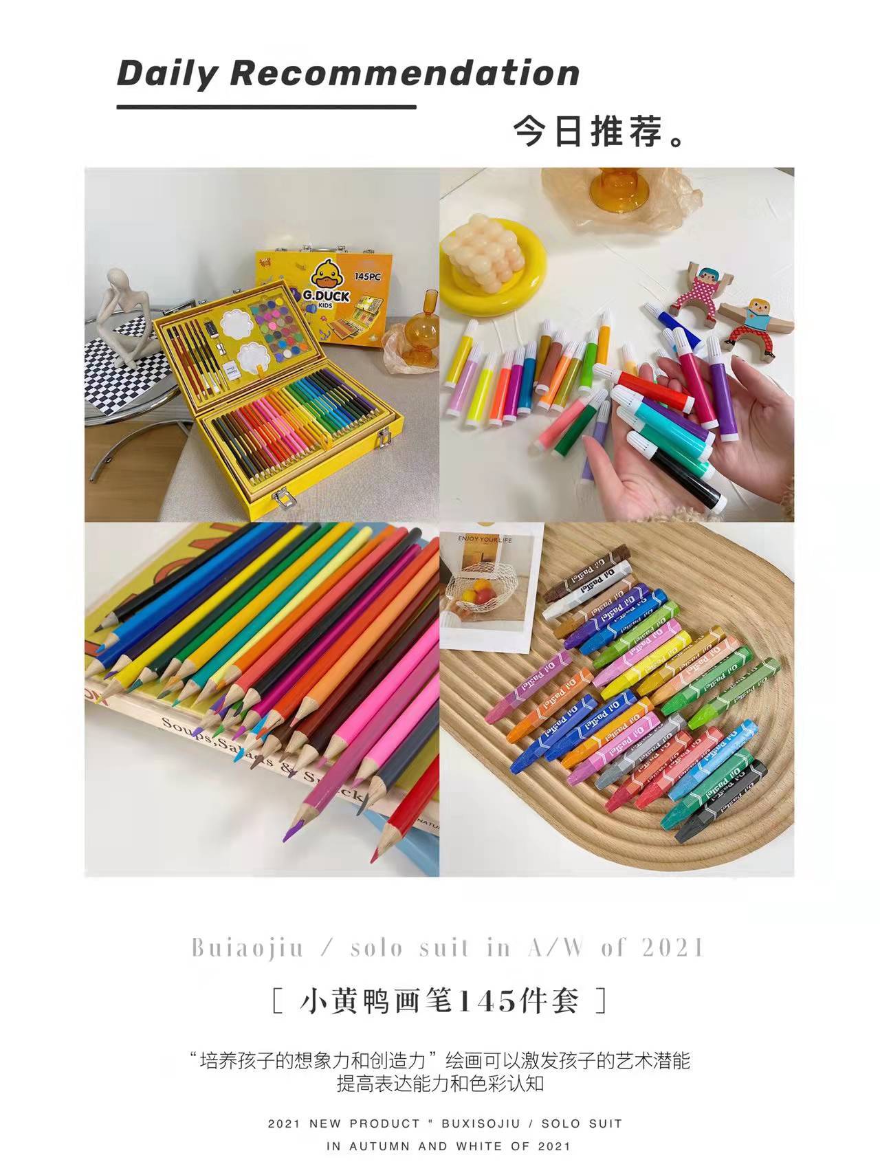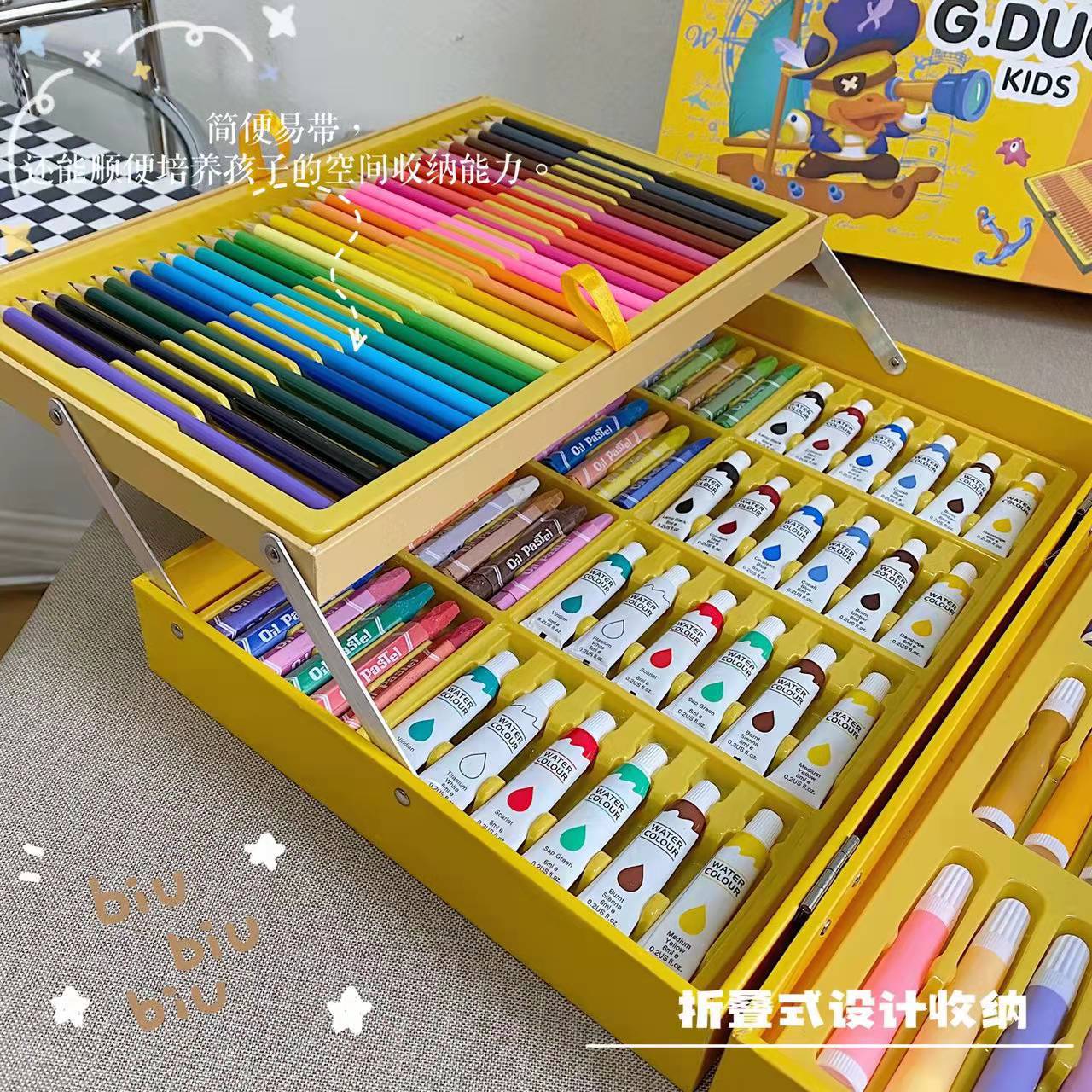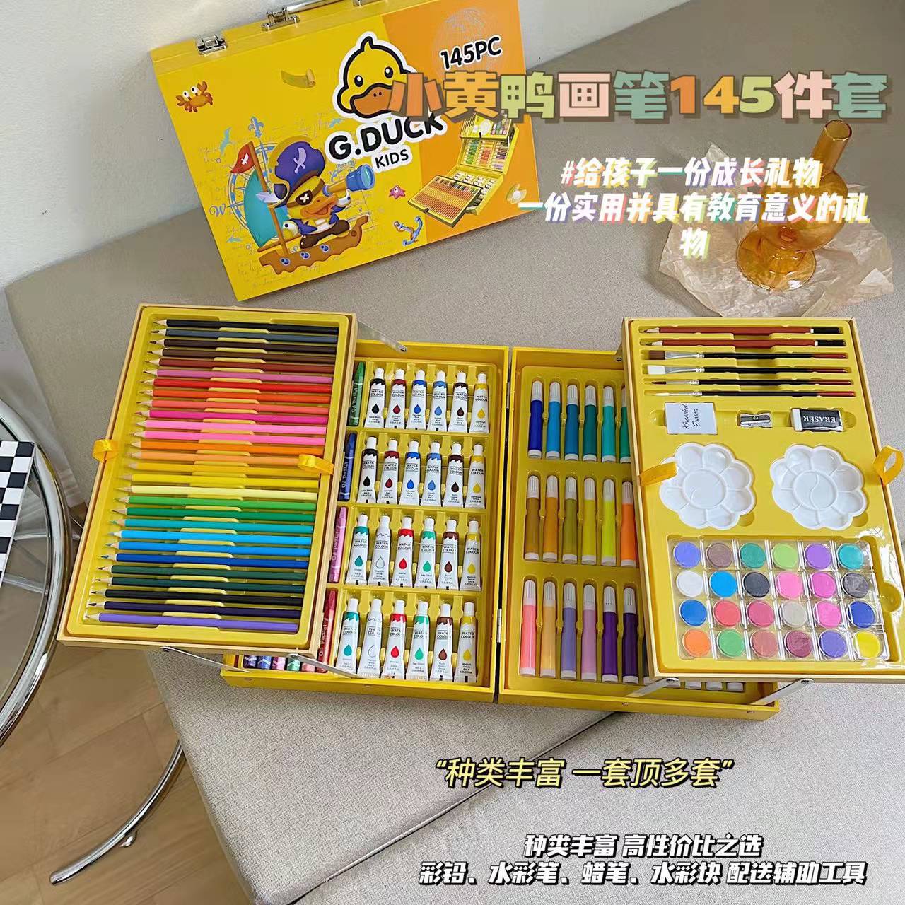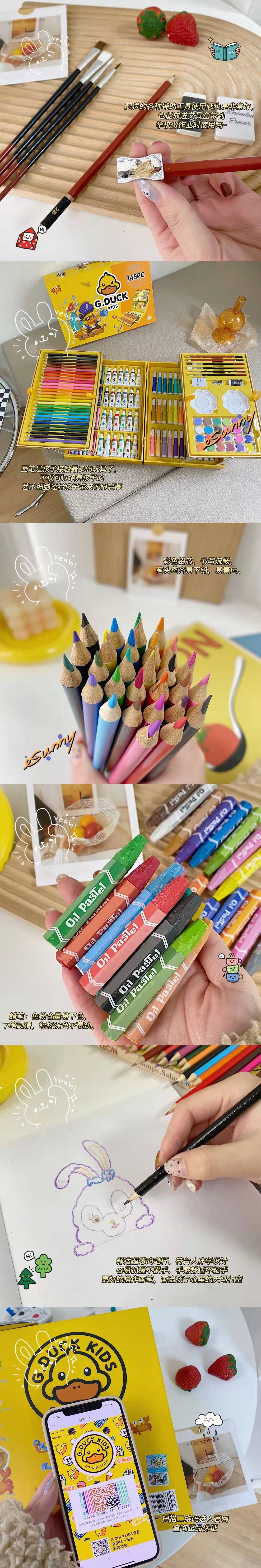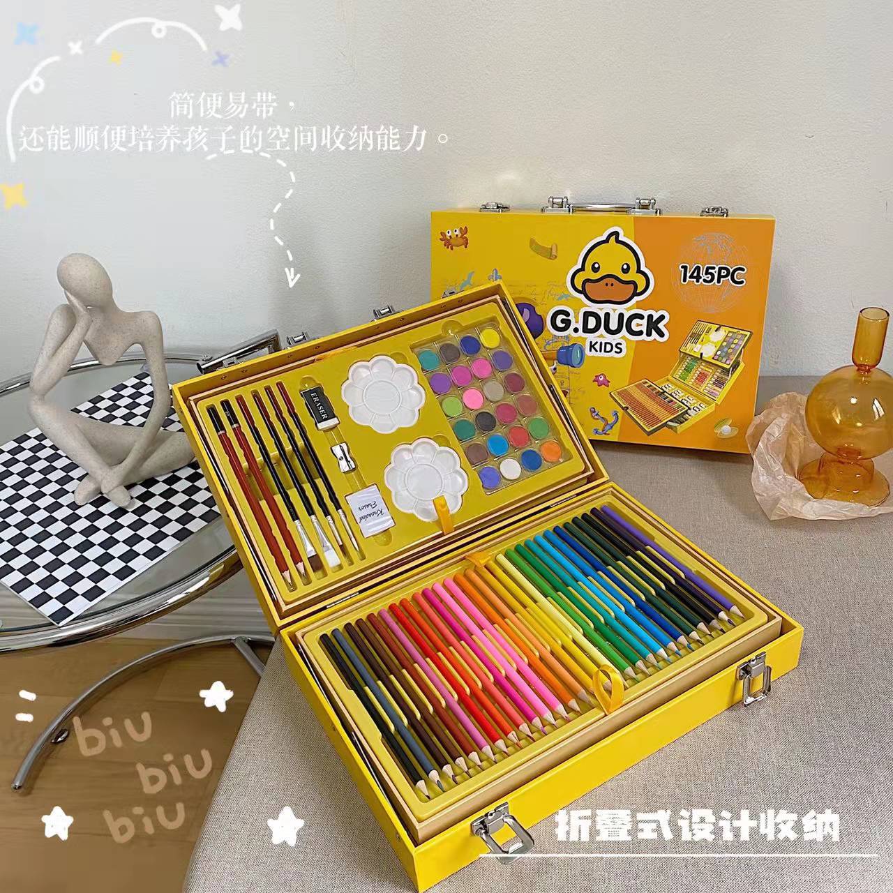 Juego de pinceles de pato amarillo pequeño para niños, 145 piezas, caja de regalo, papelería, pastel al óleo, bolígrafo de colores para niños