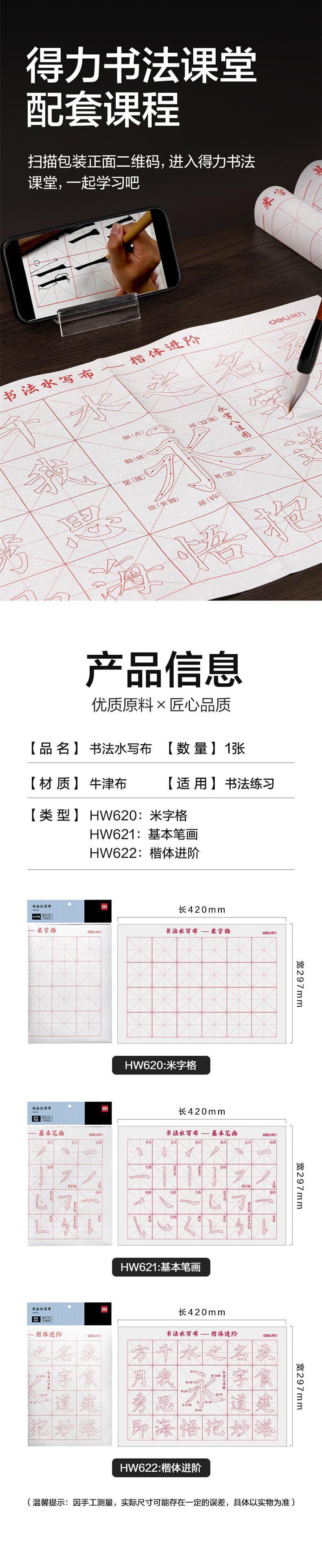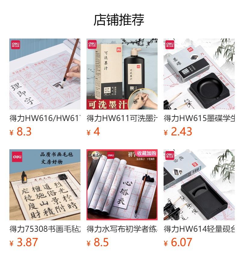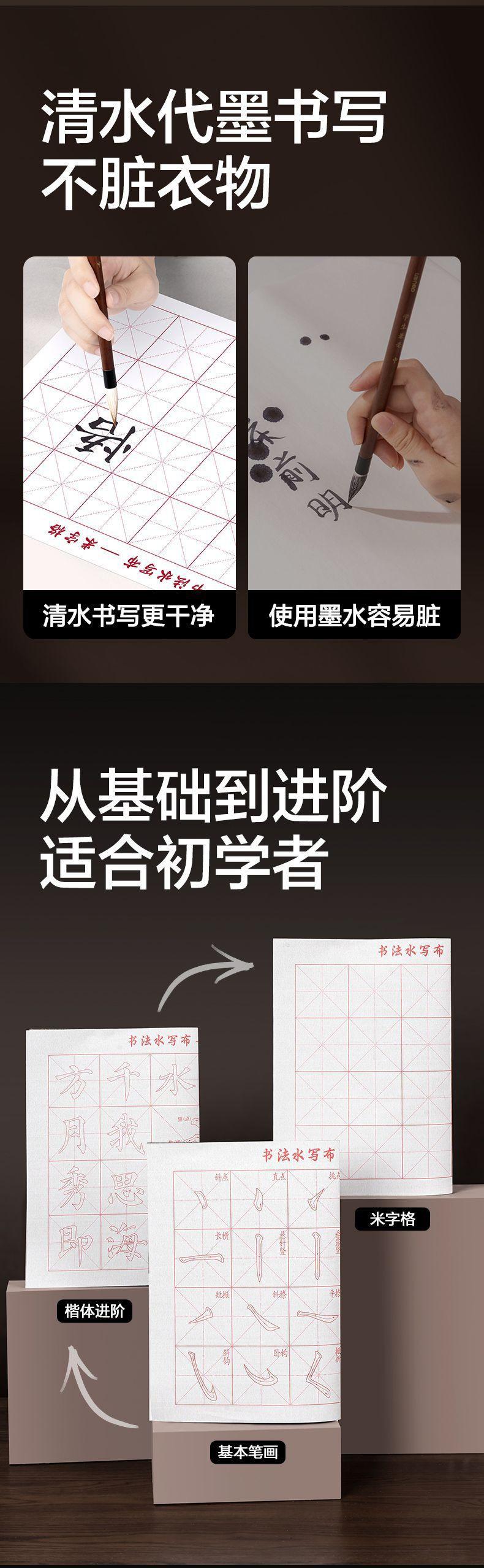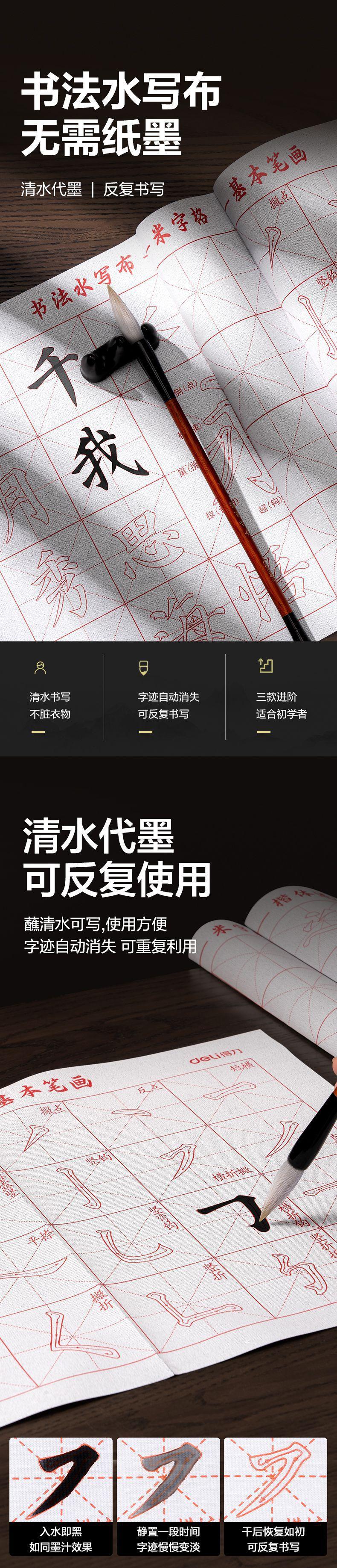 Deli HW620 Paño de escritura con agua individual, pincel de caligrafía para estudiantes, paño de lavado con palabras de arroz, para principiantes, práctica de caligrafía
