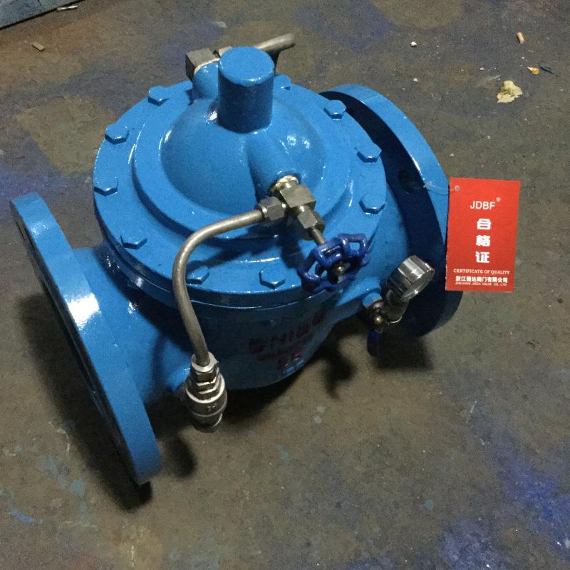 Cuando el agua entra en la tubería desde el extremo de entrada de agua de la válvula, el agua pasa a través del microfiltro, la válvula de aguja y la válvula unidireccional y entra en la cámara de control de la tapa de la válvula, y luego se descarga aguas abajo a través de la válvula de bola. Dado que la válvula de aguja tiene una abertura pequeña, generalmente es suficiente abrirla 1/4 de vuelta, por lo que la velocidad de descarga en la cámara de control es mayor que la velocidad de reposición del agua de entrada. Como resultado, la presión en la cámara de control disminuye, y la presión de entrada que actúa debajo del disco de la válvula principal levanta el disco de la válvula principal, abriendo así el disco de la válvula principal para suministrar agua aguas abajo. Cuando la tubería deja de suministrar agua, el agua aguas abajo comienza a fluir de regreso. Debido a la acción de la válvula unidireccional, una parte del agua retornada no puede salir después de entrar en la cámara de control de la tapa de la válvula a través de la válvula de bola, y la presión aumenta gradualmente, y finalmente el disco de la válvula principal se cierra herméticamente, impidiendo que el agua fluya de regreso aguas abajo y desempeñando un papel de cierre lento y silencioso.