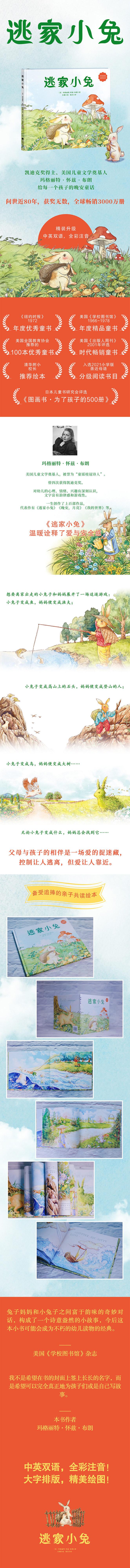 "El conejito fugitivo" es una obra representativa de Margaret Wise Brown, una escritora estadounidense de literatura infantil. A través de la conversación entre el conejito que quiere huir de casa y su madre, imagina un juego de persecución y presenta el tema del amor y la seguridad de una manera alegre. Este es un libro pequeño y sencillo, pero puede permitir a los niños escapar de los problemas de la vida diaria, entrar en el mundo eterno de los cuentos de hadas y obtener una sensación de tranquilidad y placer.