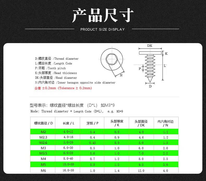 M2*4, M2*5, M2*6, M2*8, M2*10, M2*12, M2.3*4, M2.3*5, M2.3*6, M2.3*8, M2.3*10, M2.3*12, M2.3*14, M2.3*16, M2.6...