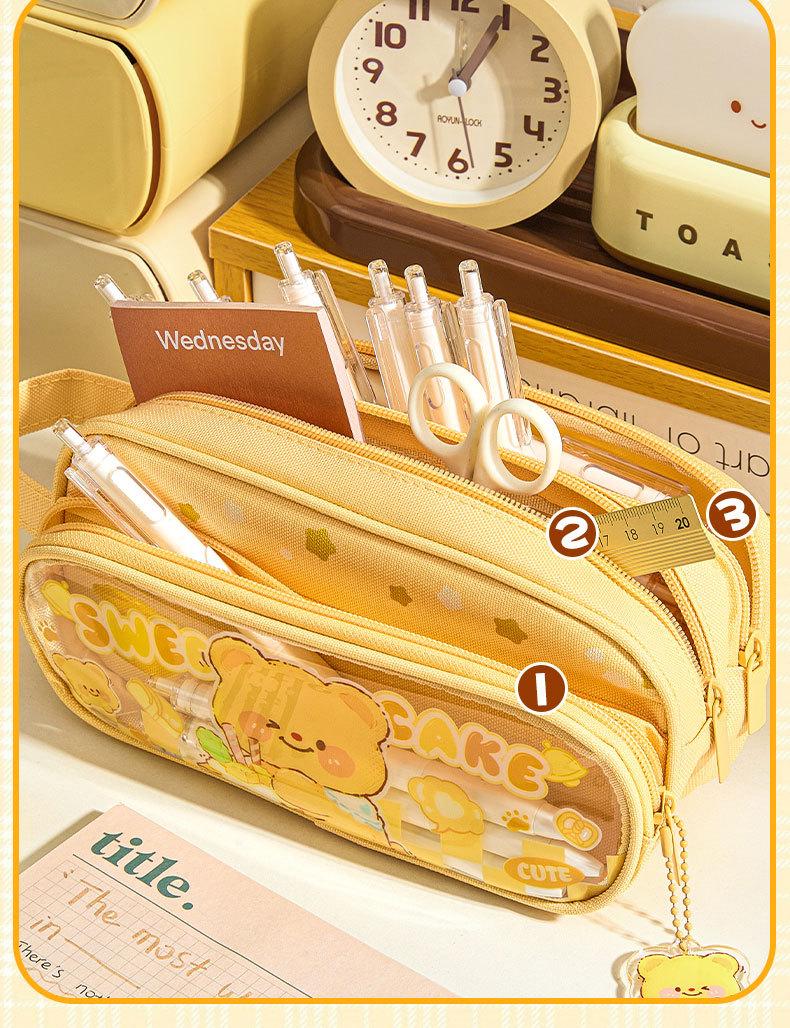 Estuche portátil transparente de tres capas con diseño de oso Kaba Estuche para lápices de gran capacidad y aspecto elegante para niñas Estuche para lápices para estudiantes de primaria