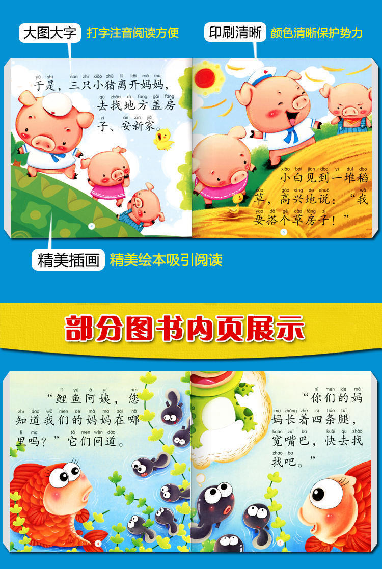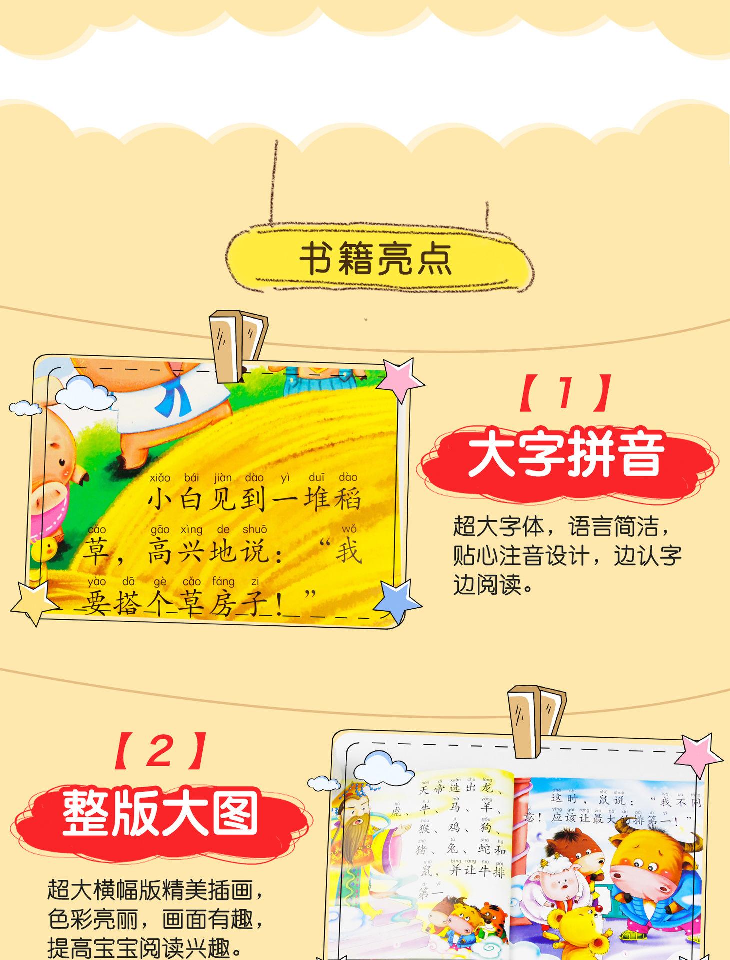 Pony crossing the river, Three Little Pigs, Pulling radish, Zodiac, Three monks, Kong Rong let pear, Cao Chong...