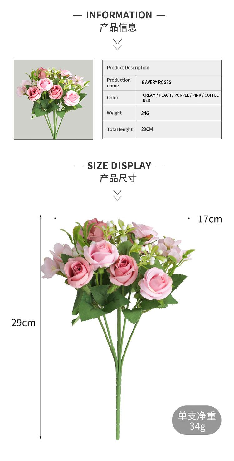Tamaño: La longitud de toda la rama es de aproximadamente 29 cm, el diámetro del ramo es de aproximadamente 17 cm y el diámetro de la flor es de aproximadamente 3 cm.