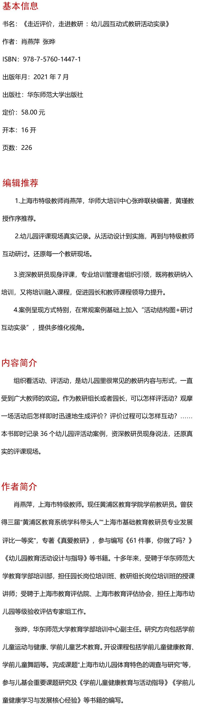 Este libro recopila actividades docentes clásicas de alta calidad observadas y comentadas en las clases de formación de directores durante los últimos diez años. Al reproducir el método de registro del proceso de discusión de preguntas y respuestas de las actividades de docencia e investigación in situ, muestra los puntos clave de la evaluación y la orientación de la actividad docente a directores de jardín de infancia, líderes de grupos de docencia e investigación, y maestros superiores, y muestra el proceso de implementación de actividades de alta calidad y los puntos clave de la orientación docente e investigadora a los maestros de primera línea. El libro está dividido en temas según las cinco áreas principales de los jardines de infancia, y el contenido se presenta en forma de planes de actividades docentes + comentarios y sugerencias de los tutores + evaluación mutua del alumnado. El caso es rico y cercano a las actividades docentes de primera línea, que puede servir de referencia para la enseñanza diaria de los maestros y tiene una gran importancia práctica de orientación.