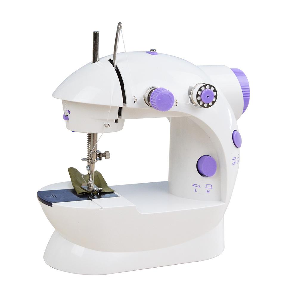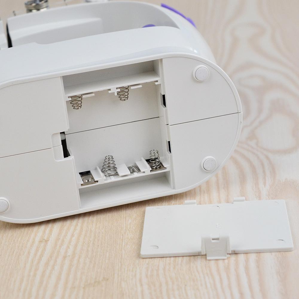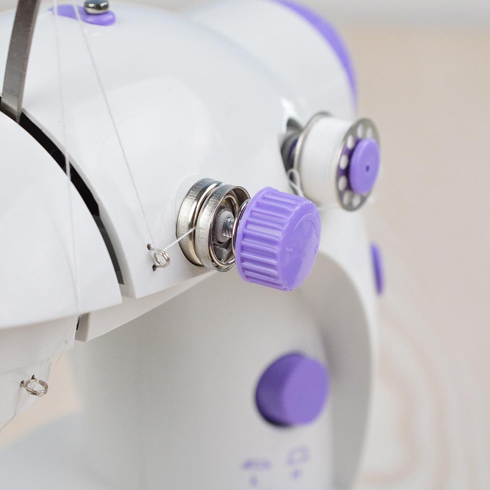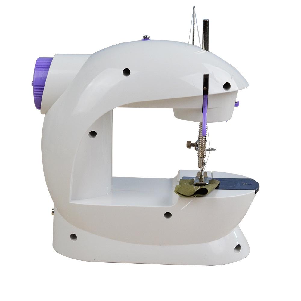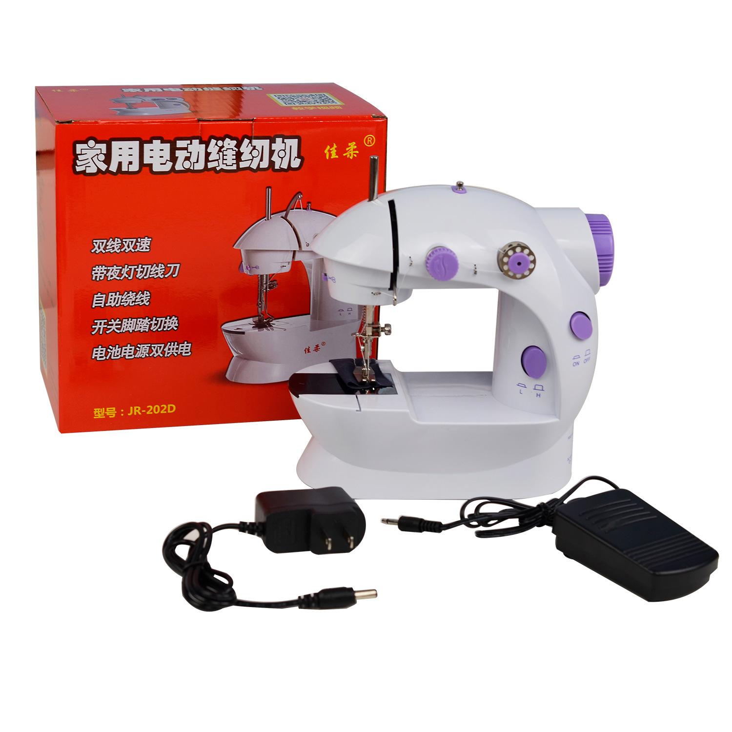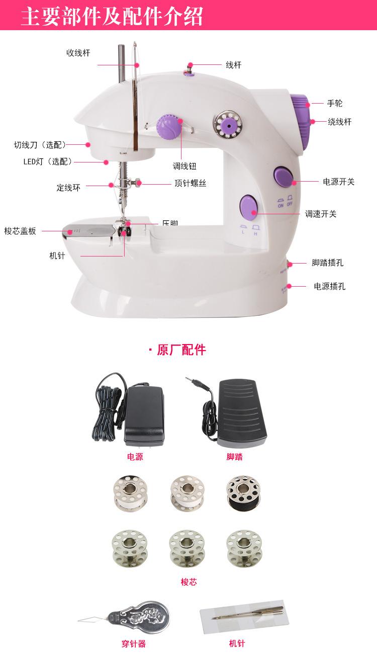 Funciones del producto: 1. Costura con doble hilo. 2. Velocidades duales, rápida y lenta. 3. Funciona con corriente o batería (no se pueden usar simultáneamente). 4. Se inicia con interruptor o pedal. 5. Incluye luz nocturna y cortador de hilo. 6. Puede enrollar el hilo en la bobina usted mismo. 7. El botón de ajuste del hilo permite ajustar la tensión.