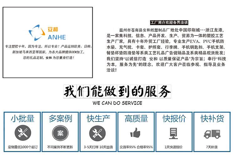 La Fábrica de Productos de Papel y Plástico Longgang Anhe del Condado de Cangnan se especializa en la producción y procesamiento de llaveros de caucho blando, bolsas impermeables para teléfonos móviles, etiquetas para equipaje, posavasos de caucho blando, productos publicitarios y promocionales, materias primas de PVC, accesorios metálicos, bolsas de embalaje y otros productos. Cuenta con un sistema de gestión de calidad completo y científico. La integridad, solidez y calidad de sus productos han sido reconocidas por la industria. Invitamos a amigos de todos los ámbitos a visitarnos, brindar orientación y negociar negocios.