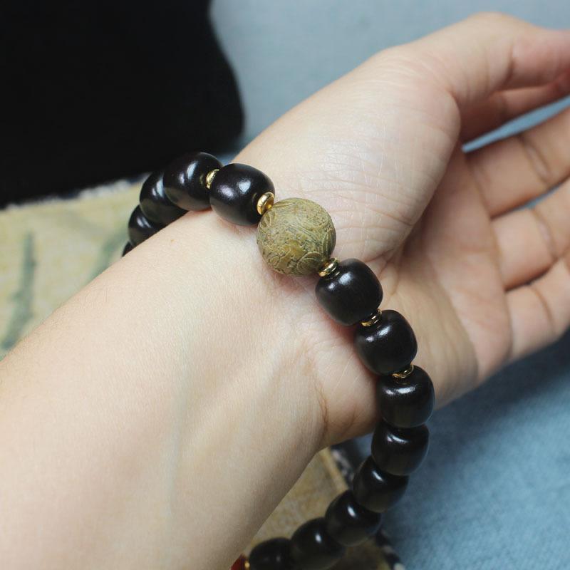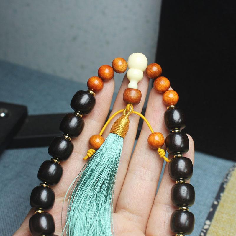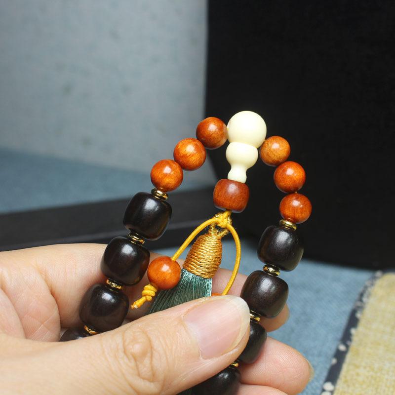 [Especificaciones] El tamaño de las cuentas de ébano antiguo es de aproximadamente 11 mm*12 mm, el diámetro de la madera de dragón de sangre es de aproximadamente 8 mm, y el diámetro de las cuentas redondas talladas de sándalo verde es de aproximadamente 15 mm. El color y la textura de cada lote pueden ser diferentes.