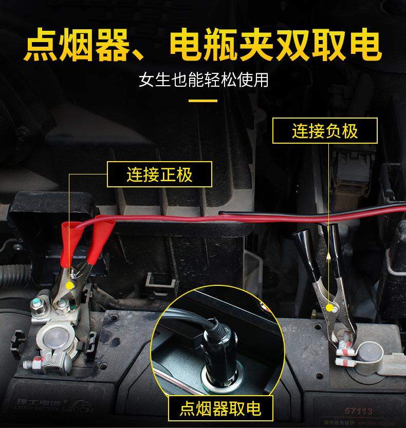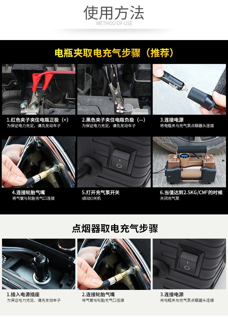 2. Retire la abrazadera del cable de alimentación de la batería (sin el enchufe del encendedor) y conéctela directamente a los polos positivo y negativo de la batería. Tenga cuidado de no tocar los cables para evitar un cortocircuito. Encienda el interruptor y podrá inflar. (La bomba de aire de doble cilindro tiene alta potencia. No la conecte directamente al encendedor a través del convertidor para obtener energía. Es fácil quemar el encendedor y el circuito del automóvil).