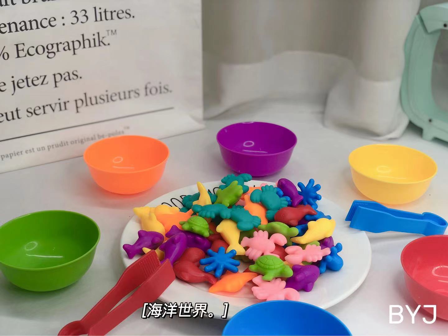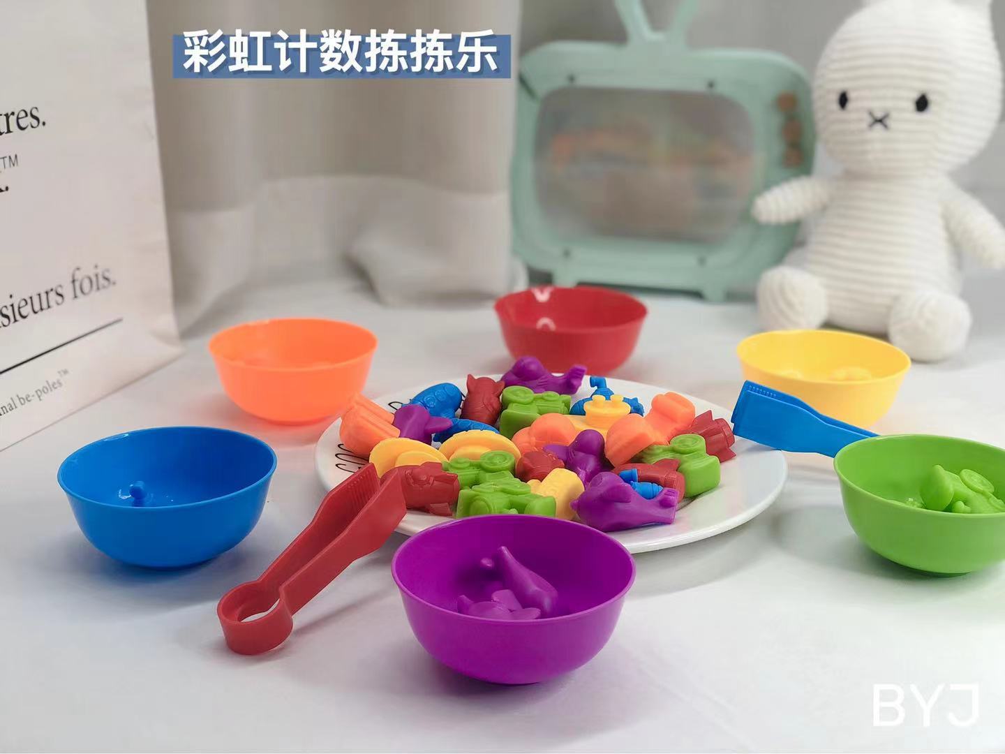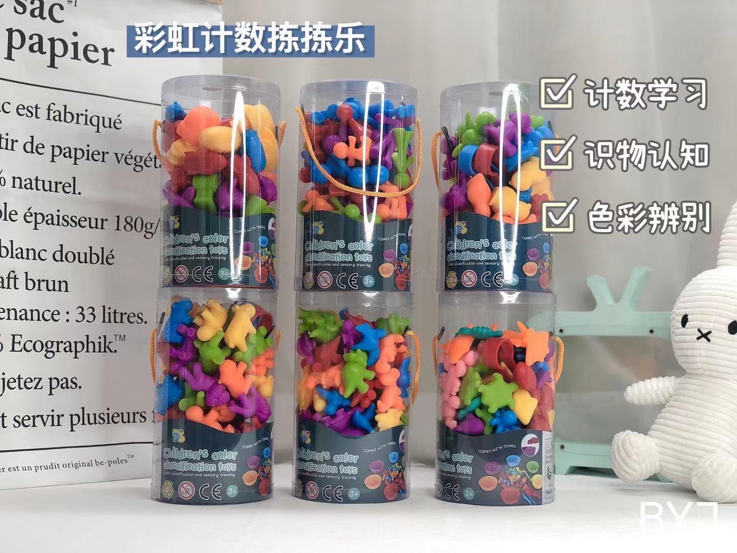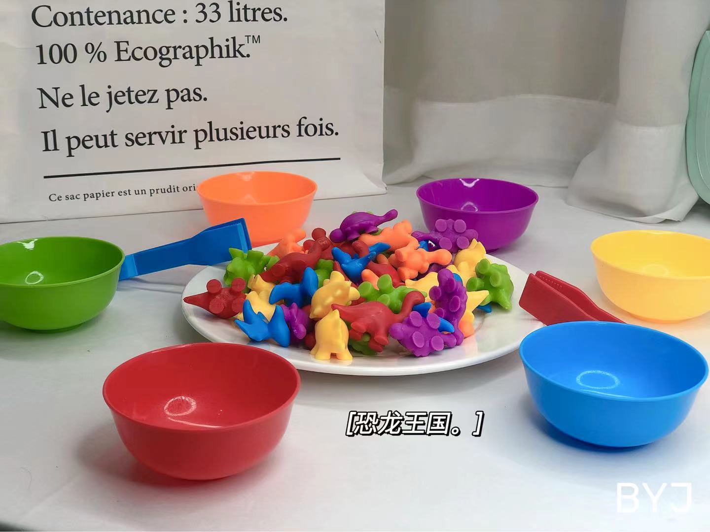 El Juego de Contar y Recoger Arcoíris tiene seis temas: transporte, miembros de la familia, mundo oceánico, reino de los dinosaurios, mundo animal y reino del bosque.