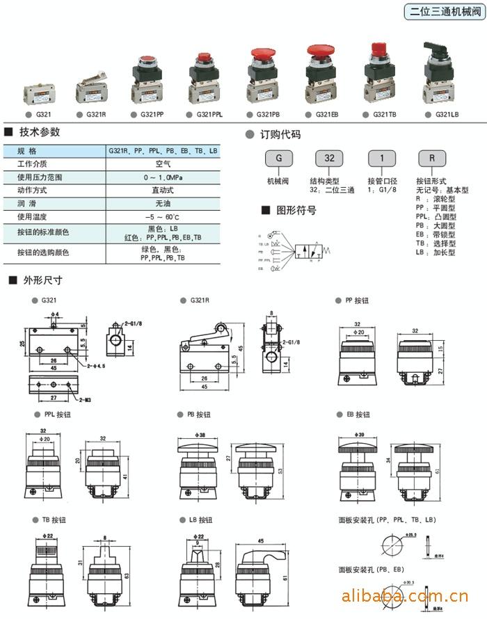 Parámetros Técnicos Especificaciones G322R, PP, PPL, PB, EB, TB Fluido Aire comprimido Tipo de Estructura Dos posiciones tres vías rosca de tubo G1/4 Rango de presión 0~1.0MPa Acción Acción directa Lubricación No requiere Temperatura de operación -5~60℃ Color estándar del botón Negro: LB Rojo: PP, PPL, PB, EB, TB Color opcional del botón Verde, negro: PP, PPL, PB, TB ■ Dimensiones ● G322 ● G321R Nota: El tipo de botón G322 es el mismo que el G321)