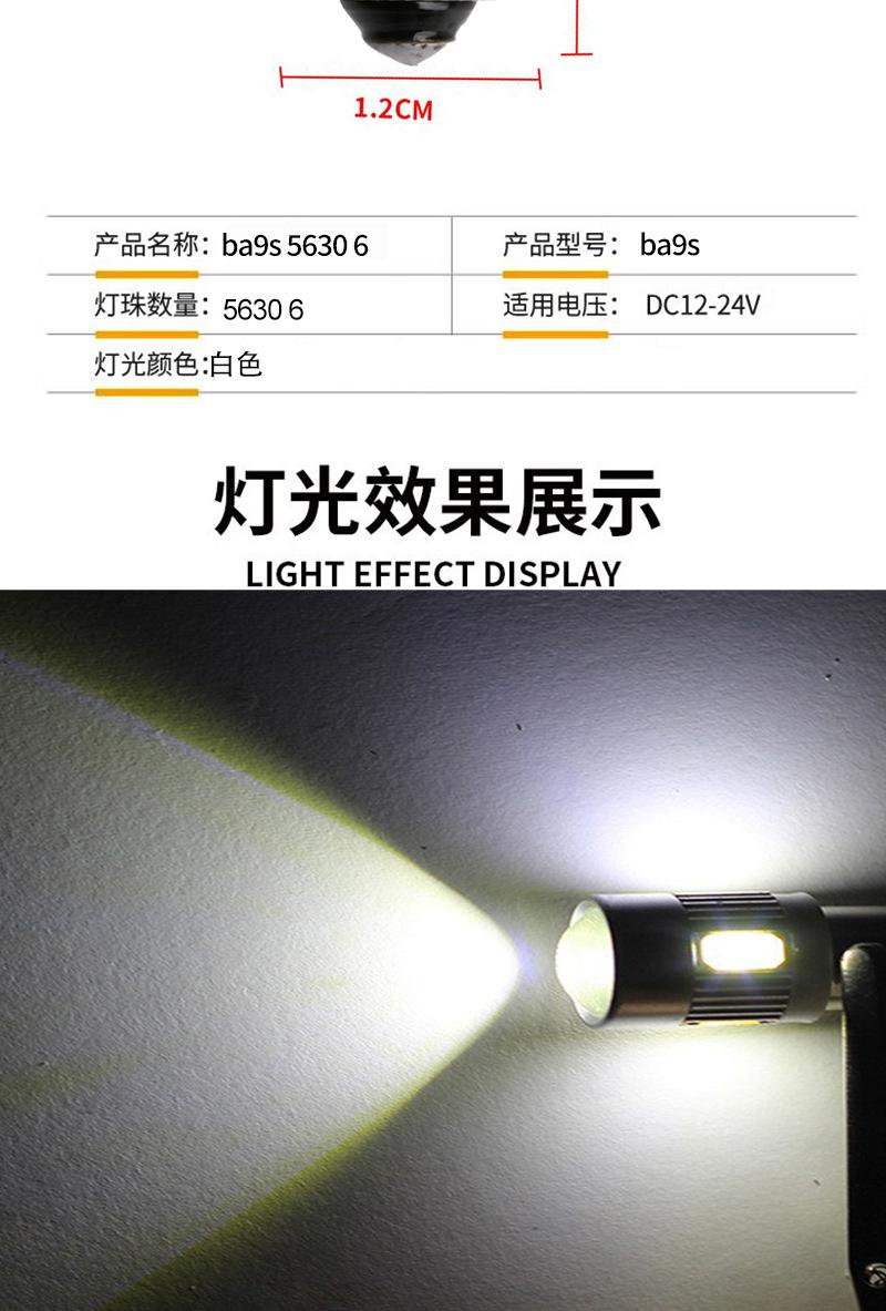 Nombre del producto: BA9S 5630 6SMD Voltaje del producto: 12 V CC (es decir, el voltaje de salida de un automóvil normal) Ángulo de irradiación: 360 grados Color de la luz del producto: luz blanca Modelo de chip: 5630