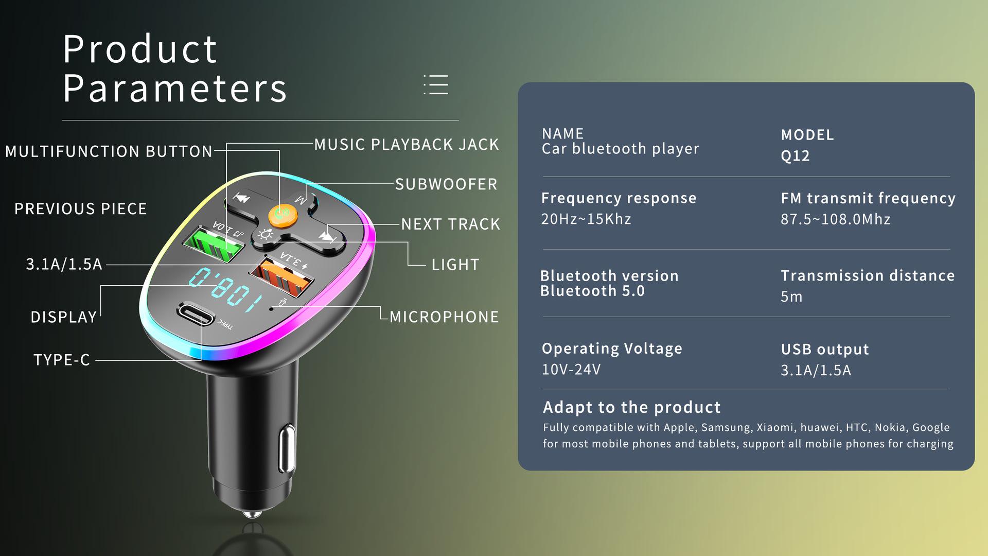 Transmisor Bluetooth Q12 para coche, MP3, FM, cargador Bluetooth para coche, tarjeta TF, reproductor de disco U, cargador PD transfronterizo para coche