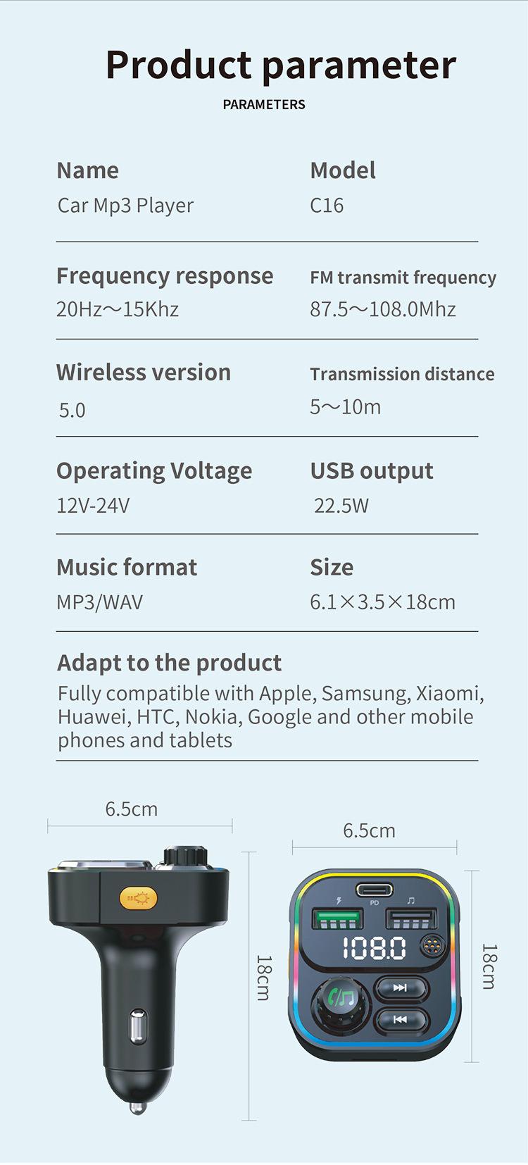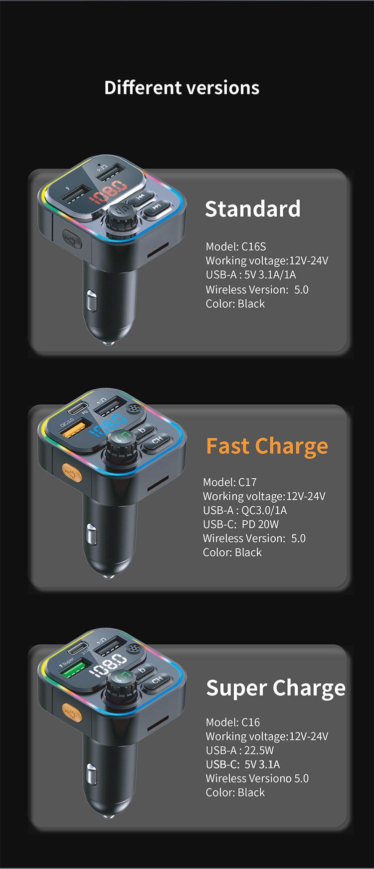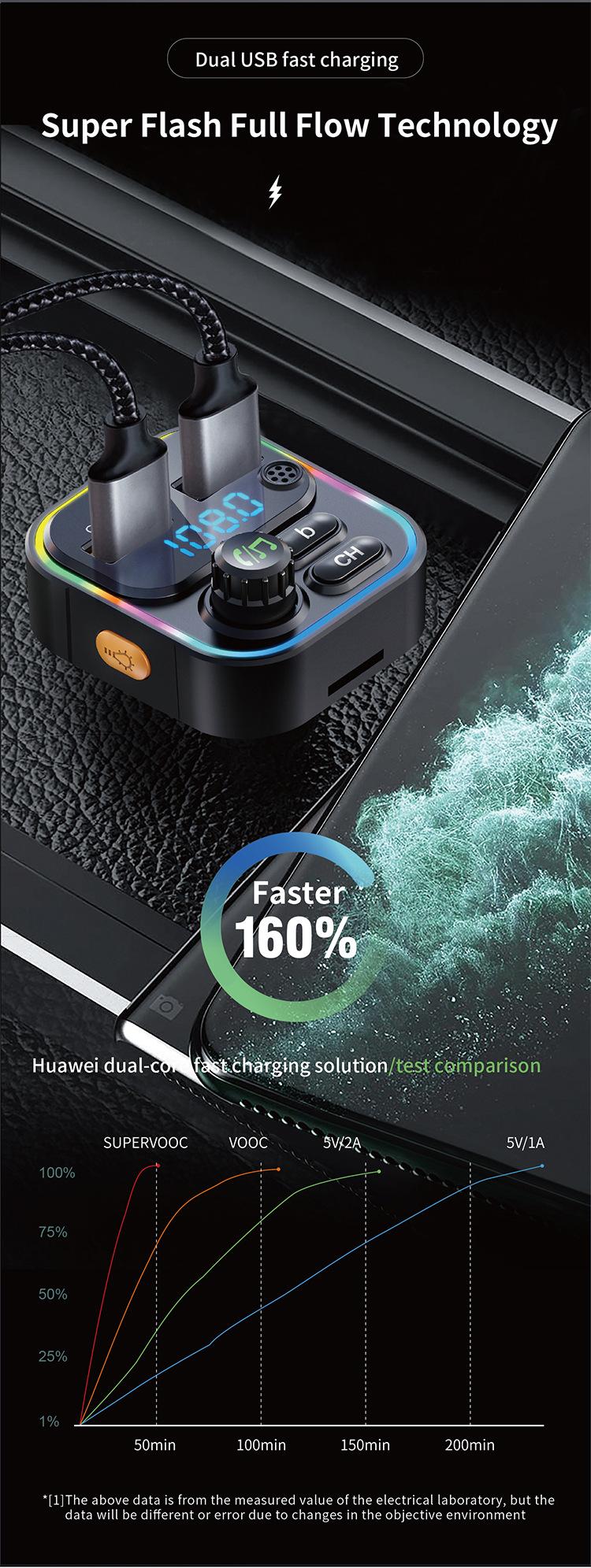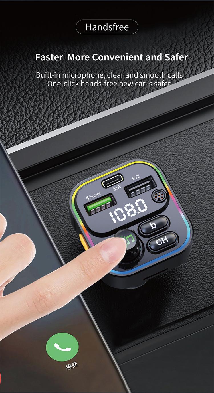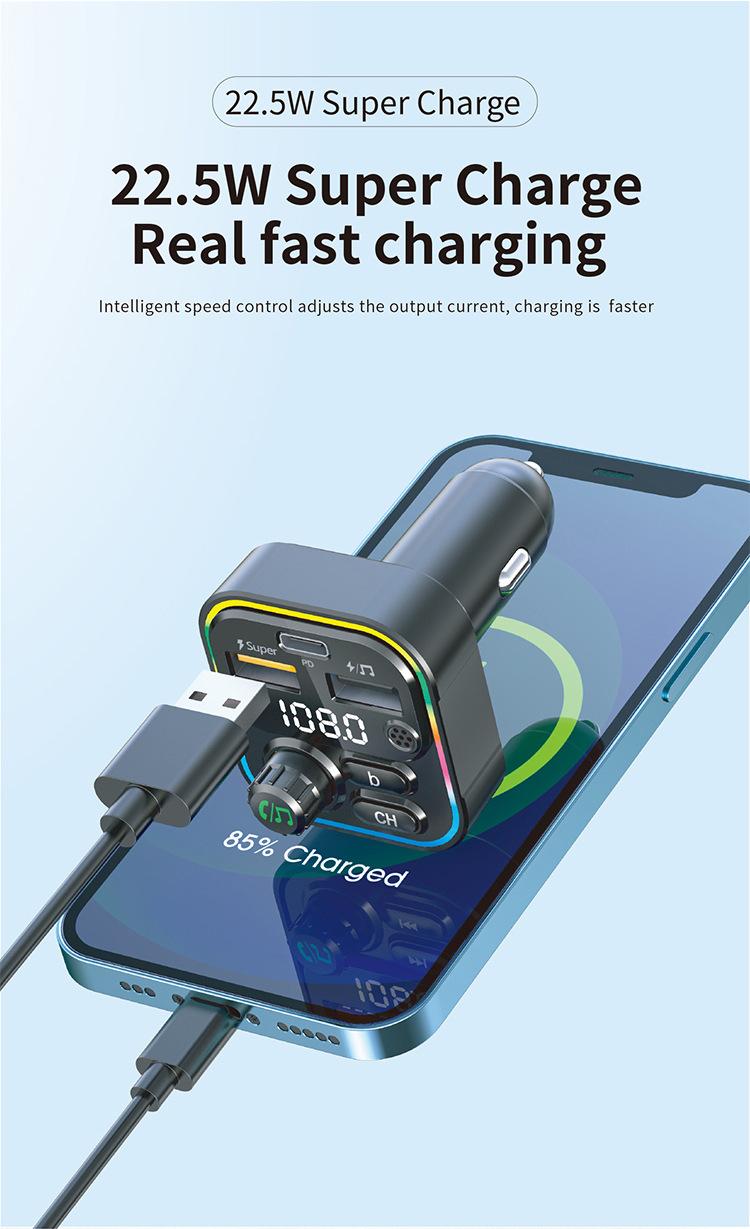 Novo carro transmissor FM Bluetooth MP3 Player TF cartão 22.5W QC3.0 telefone móvel PD carga rápida atmosfera luz