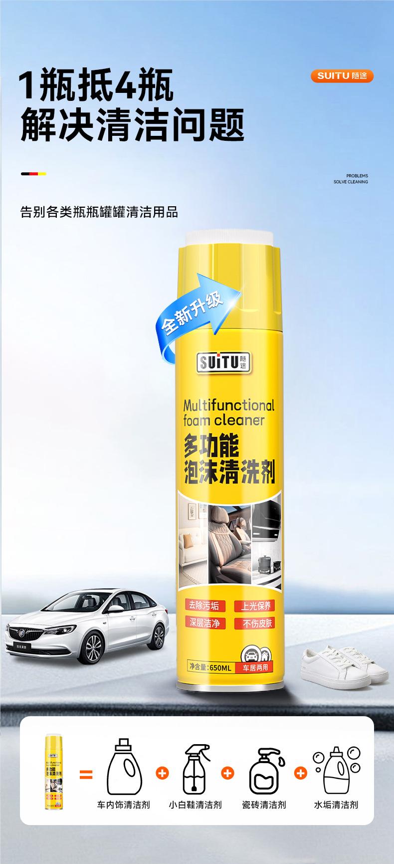 Este producto es rico en potentes moléculas descontaminantes y espuma activa. Su fórmula única lo hace apto para cualquier superficie limpia o pintada. Ofrece una potente descontaminación y una limpieza profunda. Deja los objetos como nuevos y evita que el polvo y la suciedad se depositen y se adhieran. También tiene un efecto esterilizante y desodorizante. Ideal para coches, barcos y artículos del hogar, limpia eficazmente cuero artificial, terciopelo, fibras, alfombras, productos galvanizados, carcasas eléctricas, baños, muebles, asfalto, azulejos, papel pintado o paredes con pintura de látex, cortinas, ventiladores, productos de porcelana y pinturas. Elimina manchas de aceite, té, etc., en madera, metal y mantas.