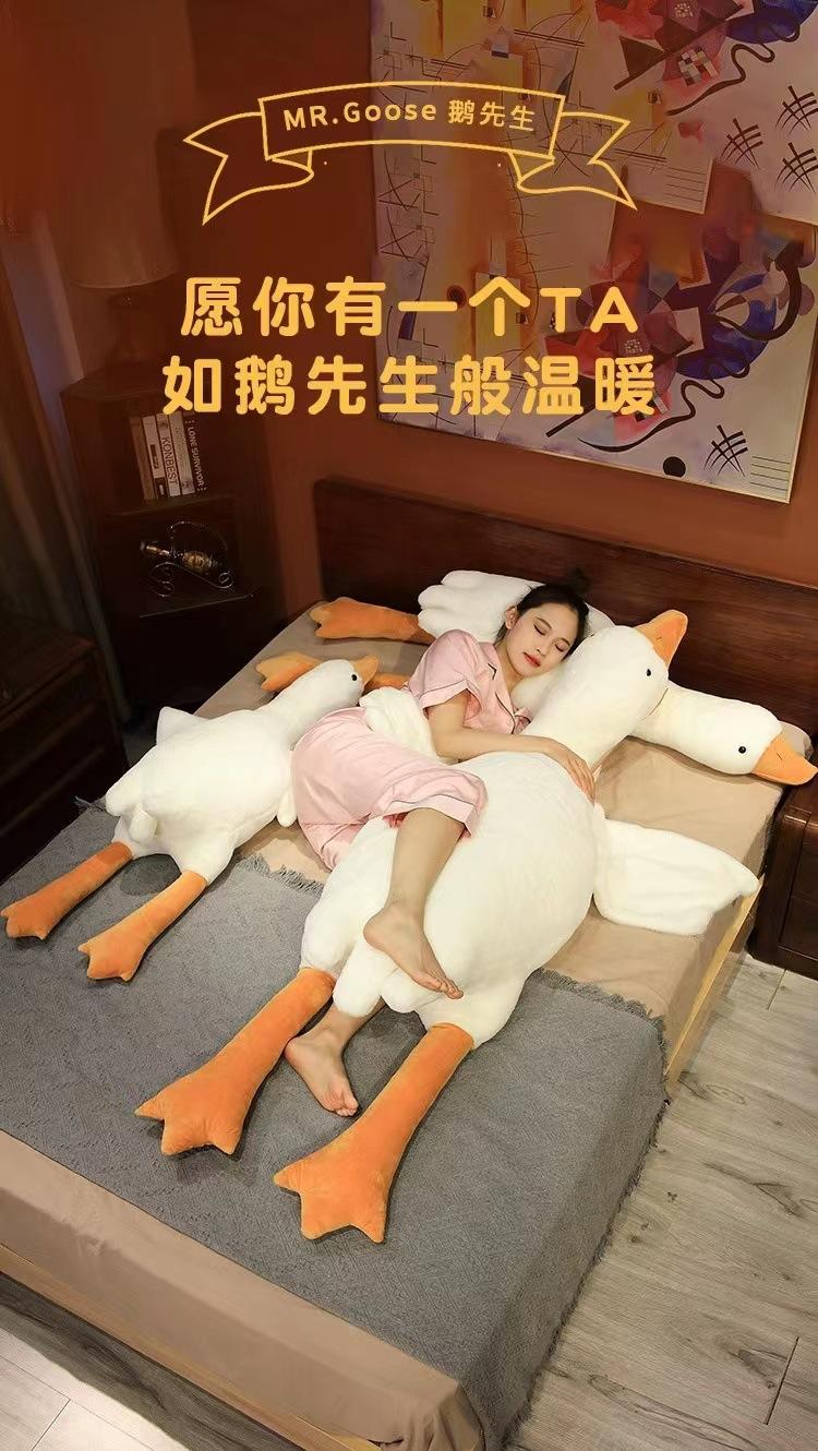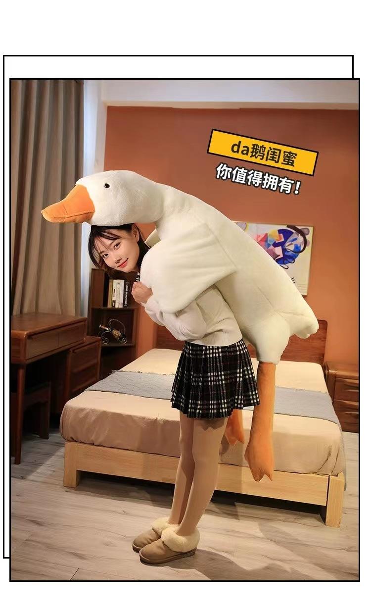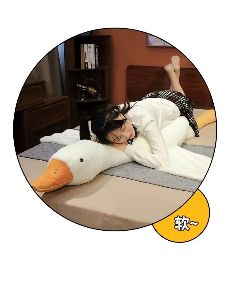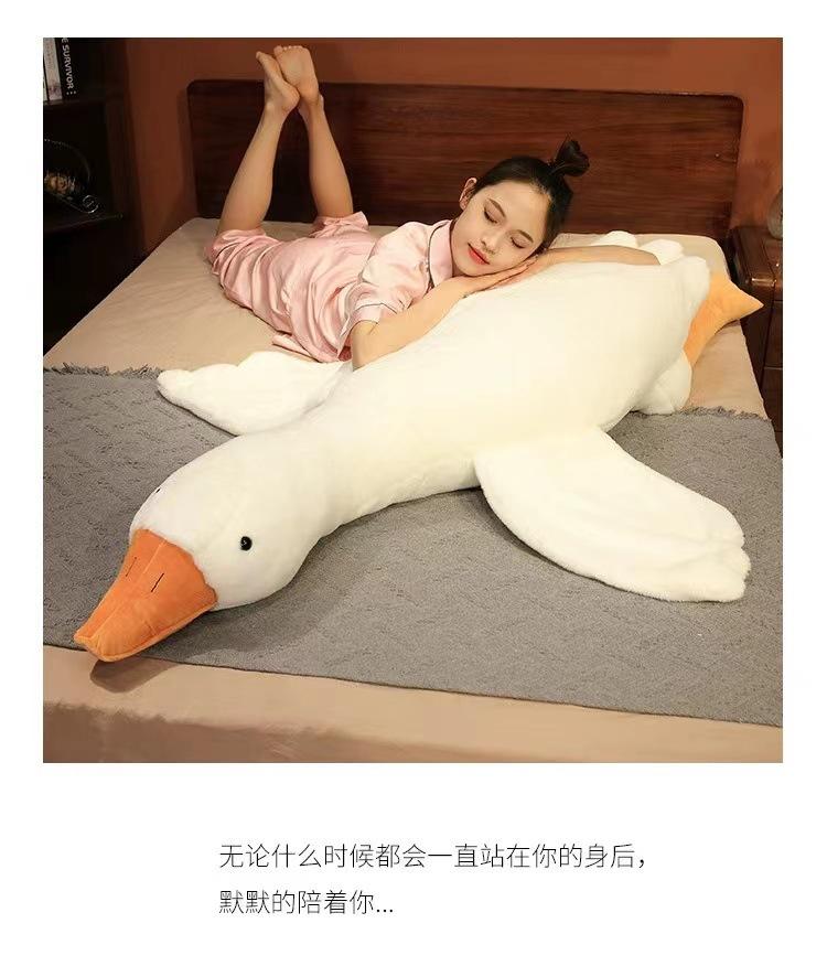 Muñeco de peluche de ganso blanco grande, famoso en Internet. Almohada de escape de ganso grande. Almohada para dormir. Muñeco de peluche durmiendo en la cama.