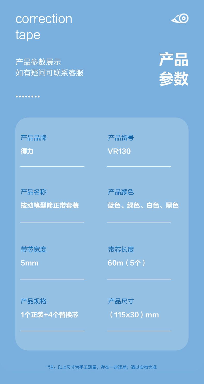 Cinta correctora tipo pluma Deli VR130, cinta correctora de núcleo reemplazable, cinta correctora de presión para estudiantes, alto valor de color, gran capacidad