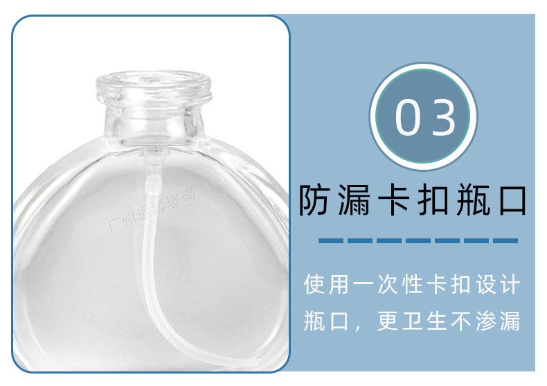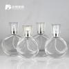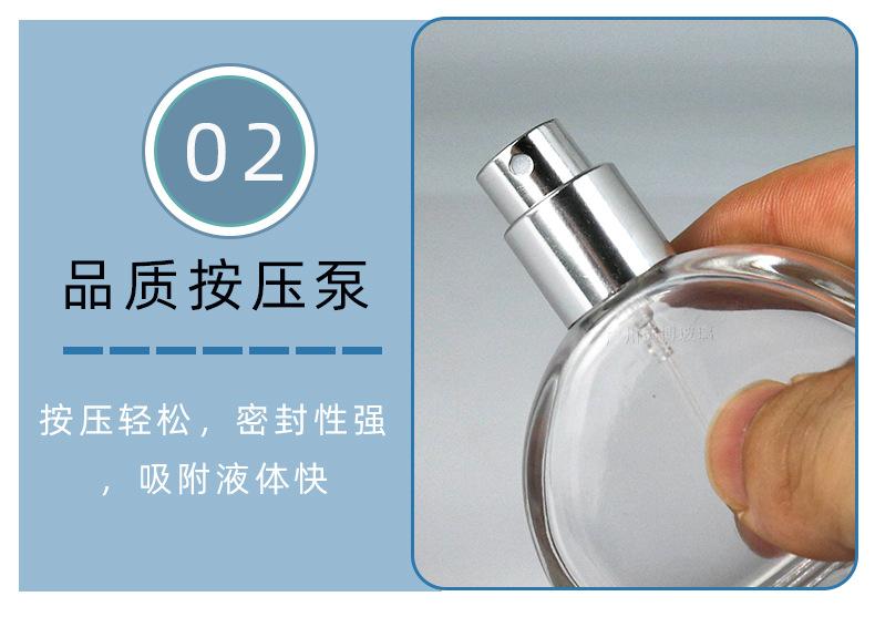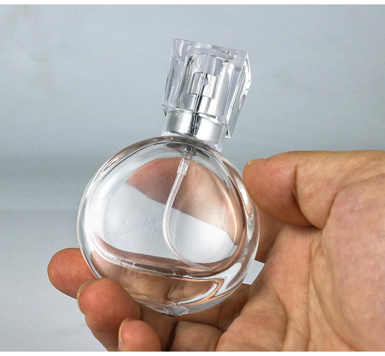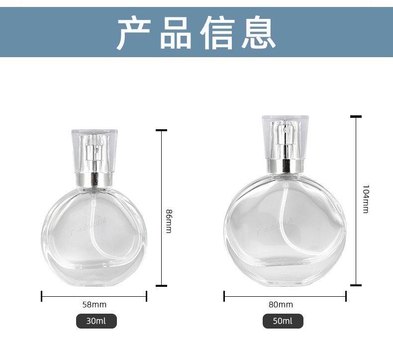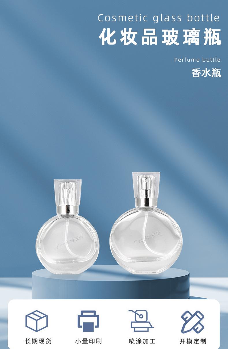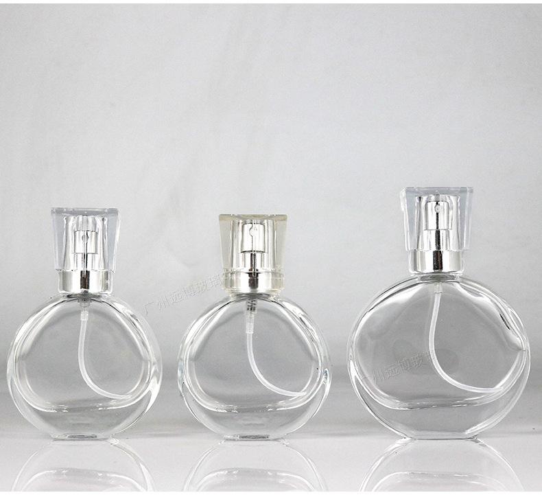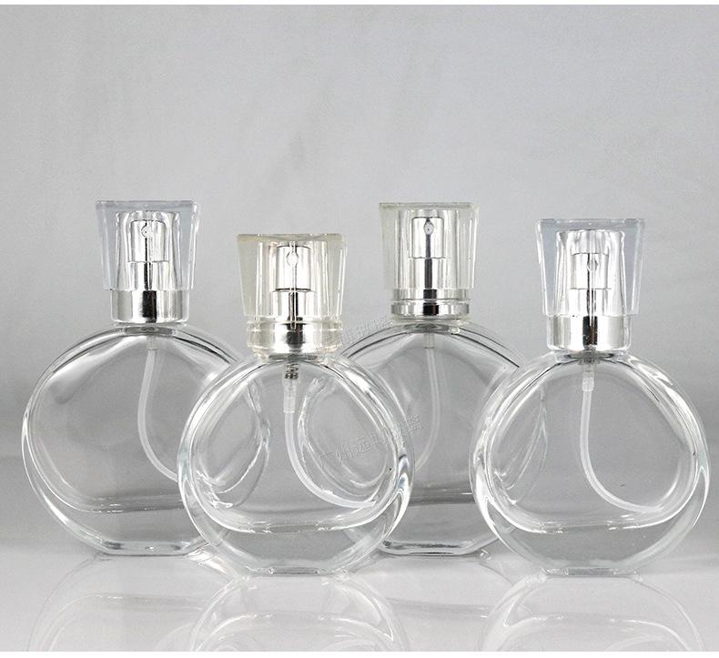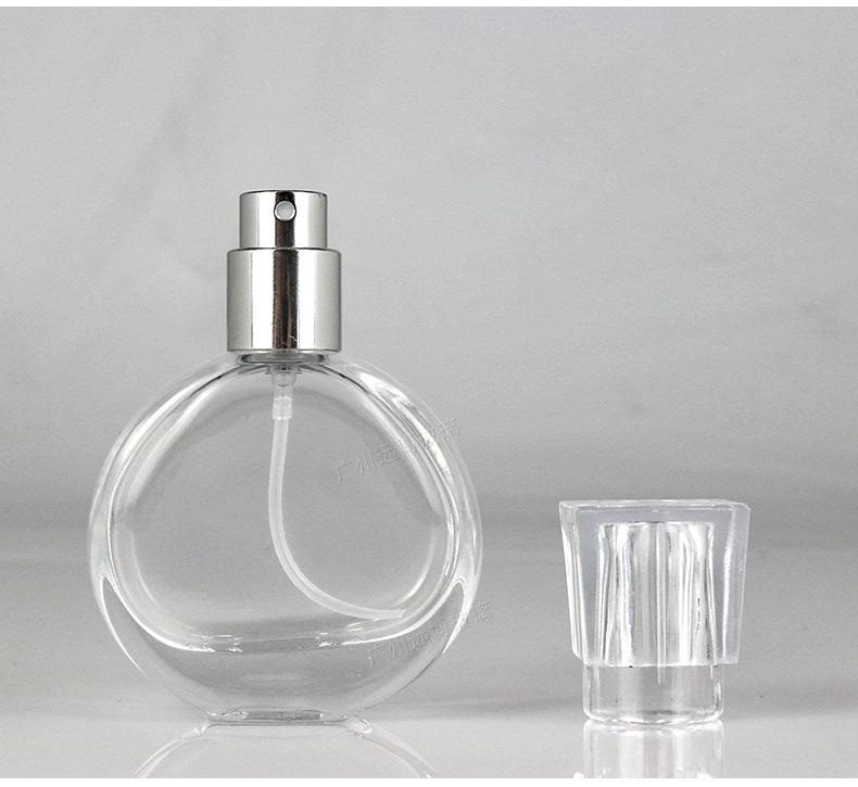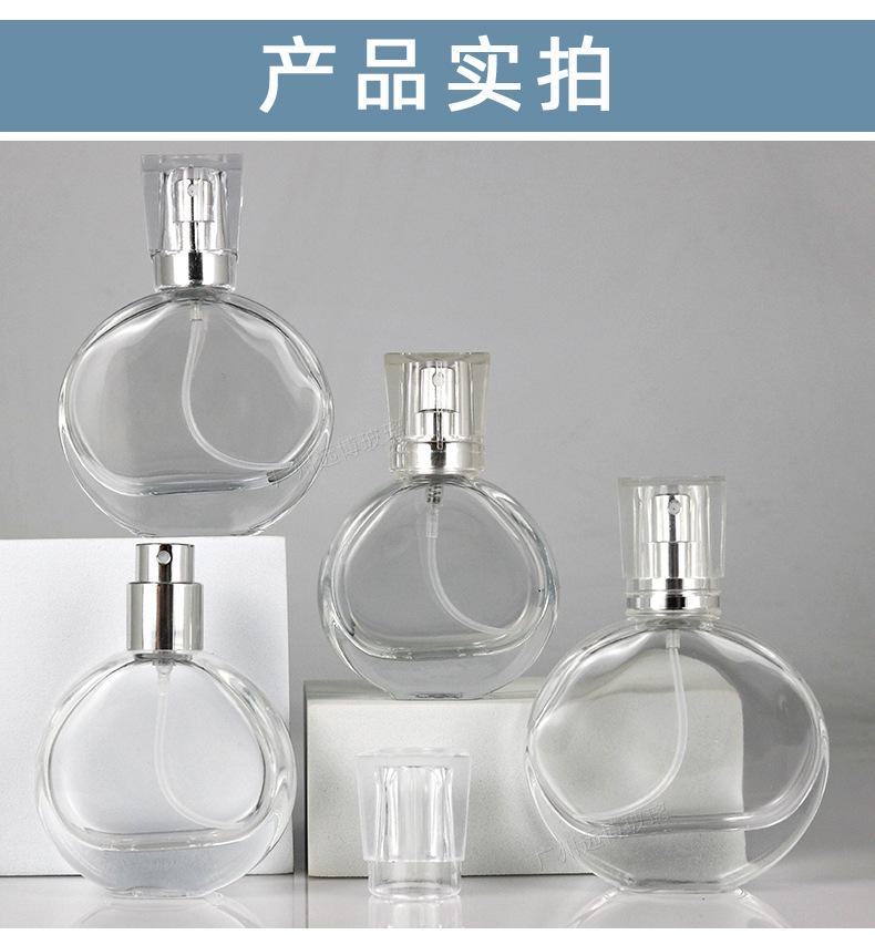 Botella de perfume portátil de vidrio, 30 ml, 50 ml, muestra cosmética, botella de vidrio vacía, fondo grueso, botella redonda plana.