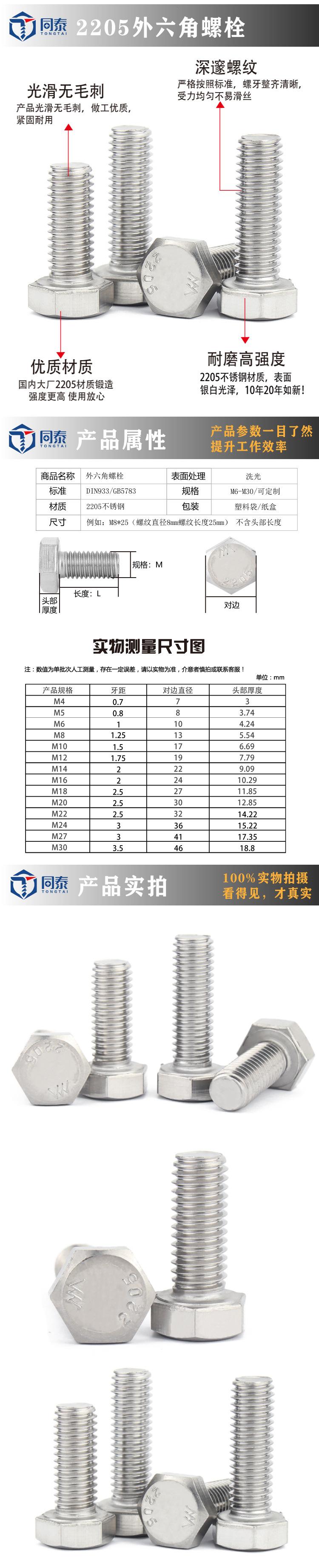 Tornillo de perno hexagonal exterior de acero inoxidable 2205, perno de acero inoxidable dúplex de grado 8.8 de alta resistencia resistente a la corrosión