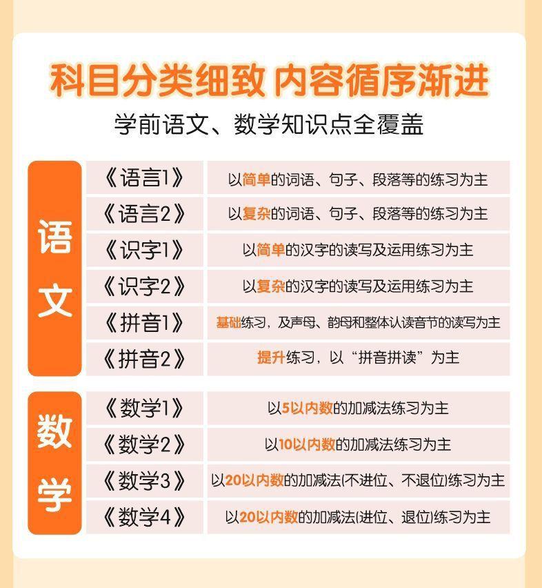 Language 1, Language 2, Literacy 1, Literacy 2, Pinyin 1, Pinyin 2, Mathematics 1 [addition and subtraction wi...