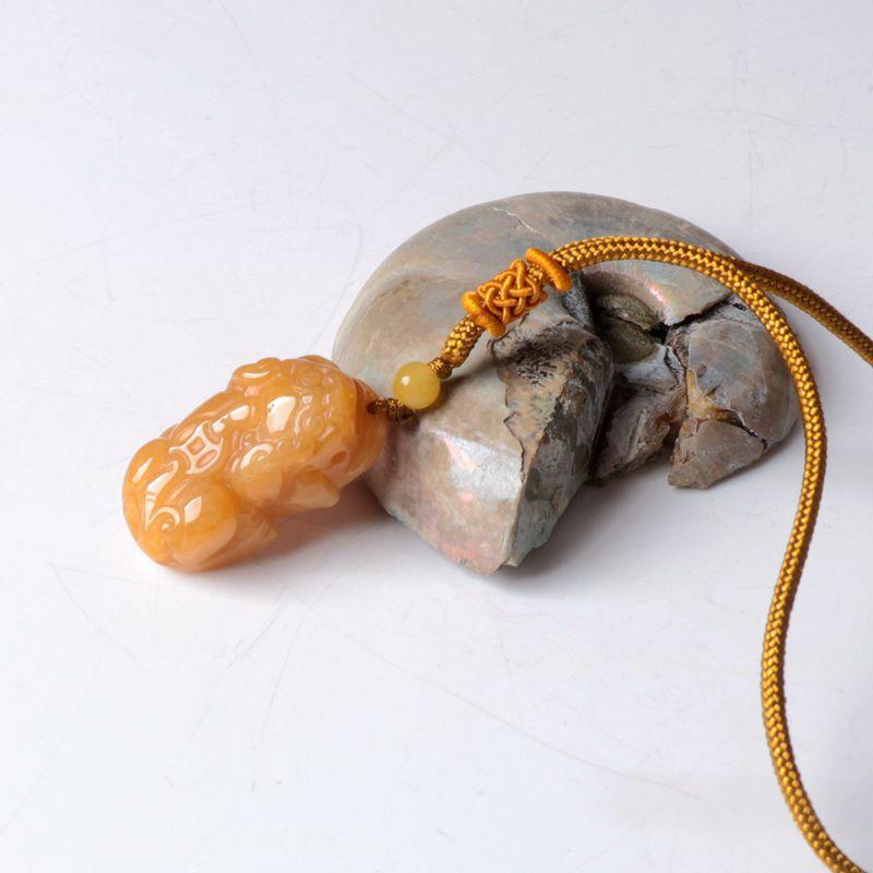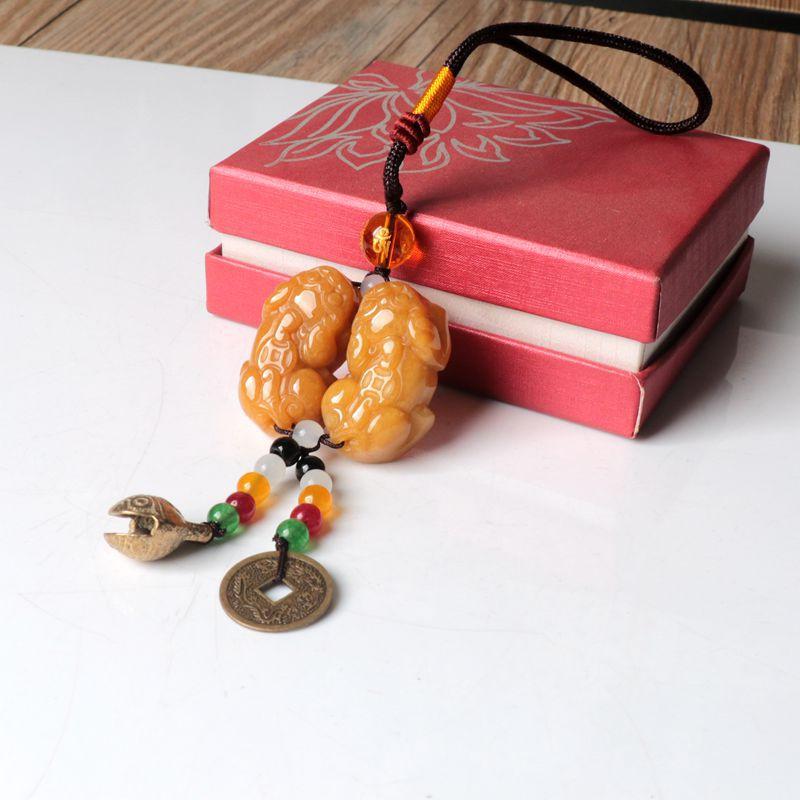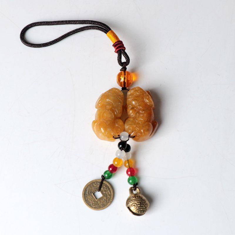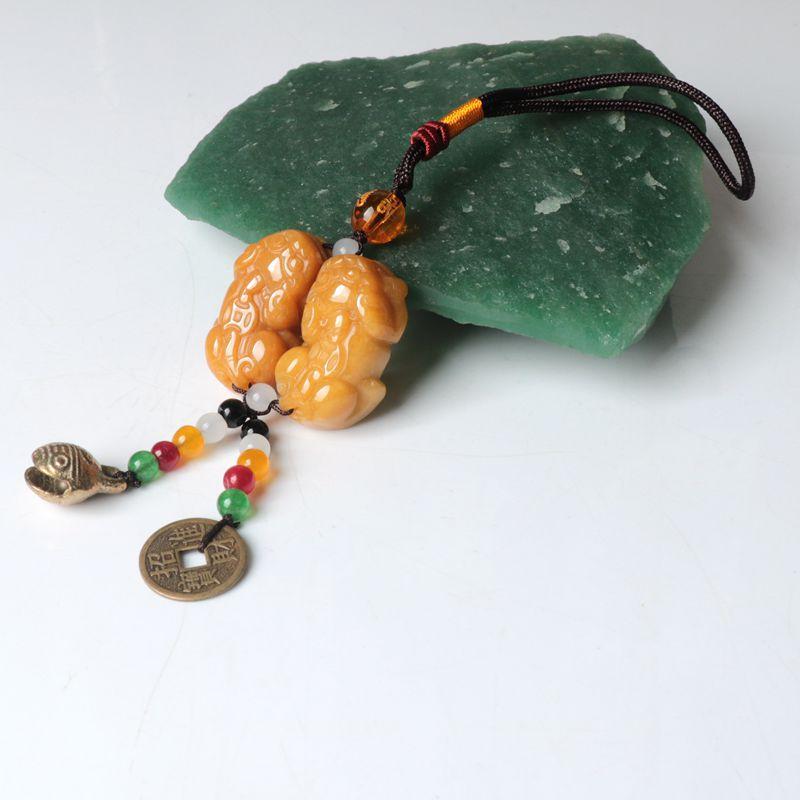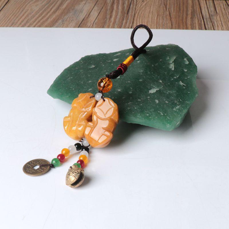 La bolsa tejida doble pixiu de jade y dragón amarillo está colgada en la pieza. El nudo café mide 10 cm de largo, la cuenta superior es una cuenta de 10 mm de seis palabras del sutra del corazón del mantra. El negro, el blanco, el amarillo, el rojo y el verde representan los cinco colores, dando vida a los ladrillos y las tejas. Monedas de cobre de dragón y fénix, y campanas.