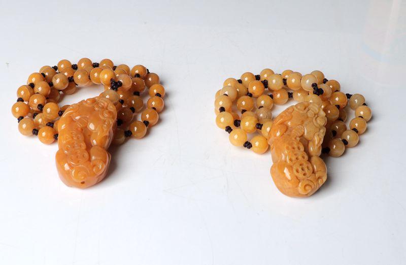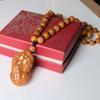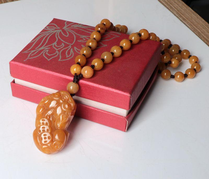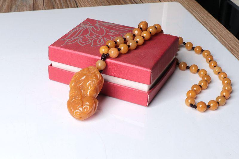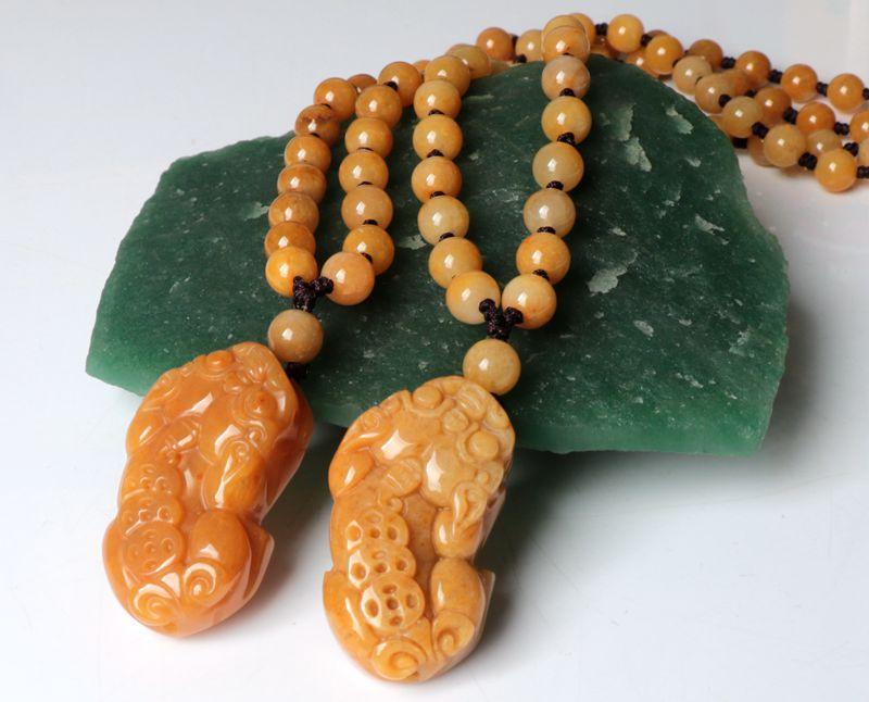 Un collar grande con tres monedas de oro y cuentas de 8 mm. Pixiu es auspicioso y a todos nos encanta. Las cuentas del collar están cuidadosamente seleccionadas, talladas a mano y provienen de la fábrica original.