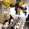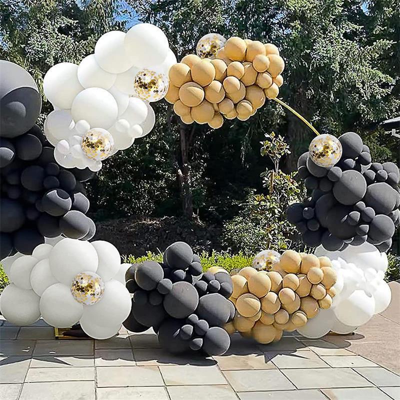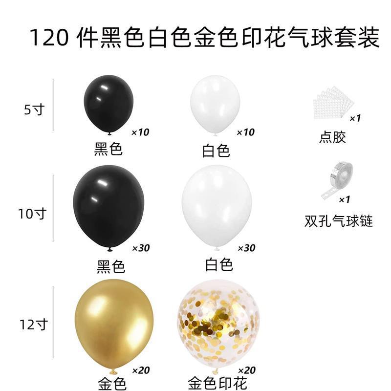 [Cantidad del producto]: 10 globos negros de 5 pulgadas; 10 globos blancos de 5 pulgadas; 30 globos negros de 10 pulgadas; 30 globos blancos de 10 pulgadas; 20 globos dorados de 12 pulgadas; 20 globos metálicos con lentejuelas de 12 pulgadas;