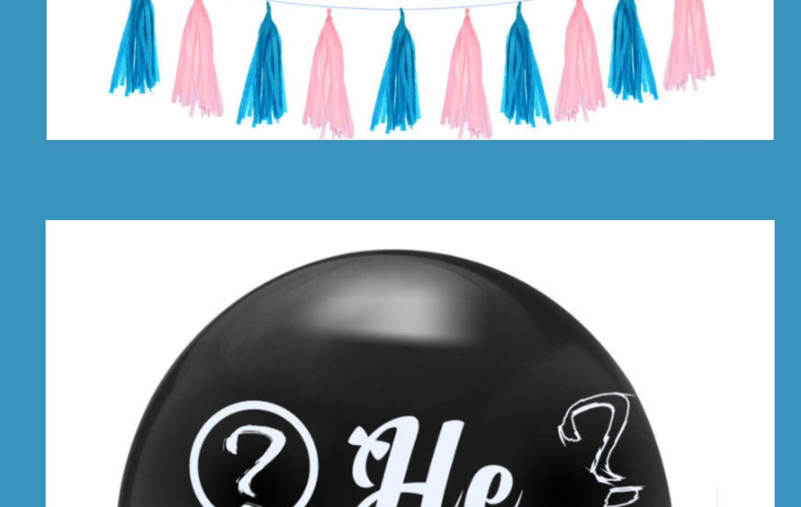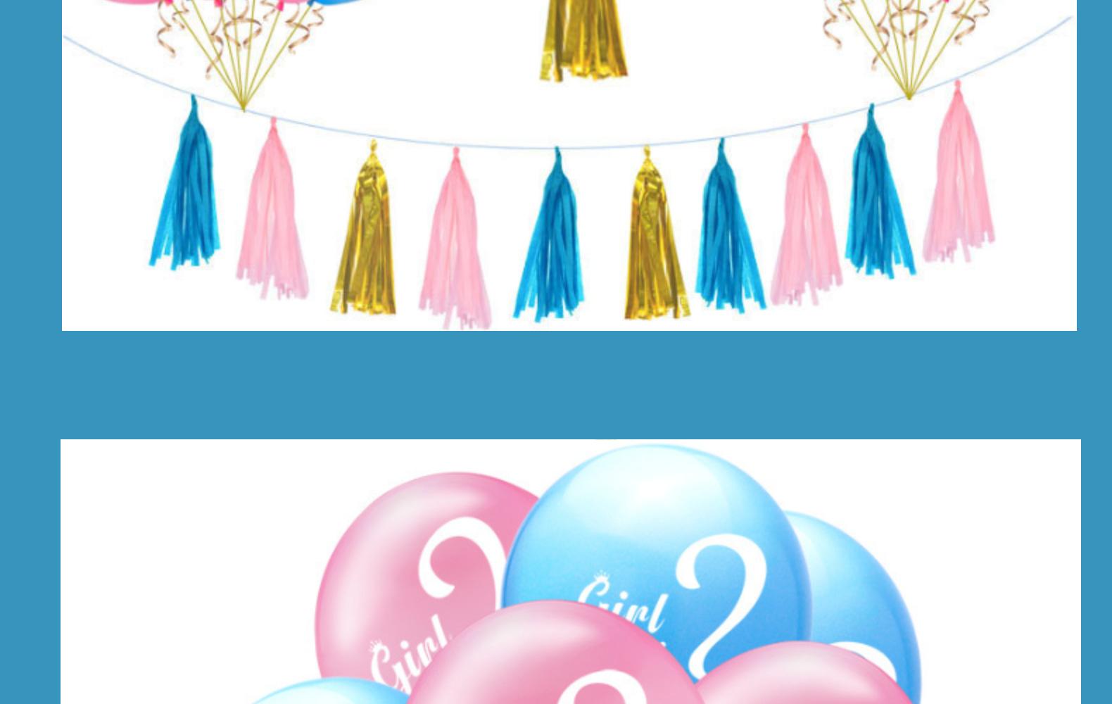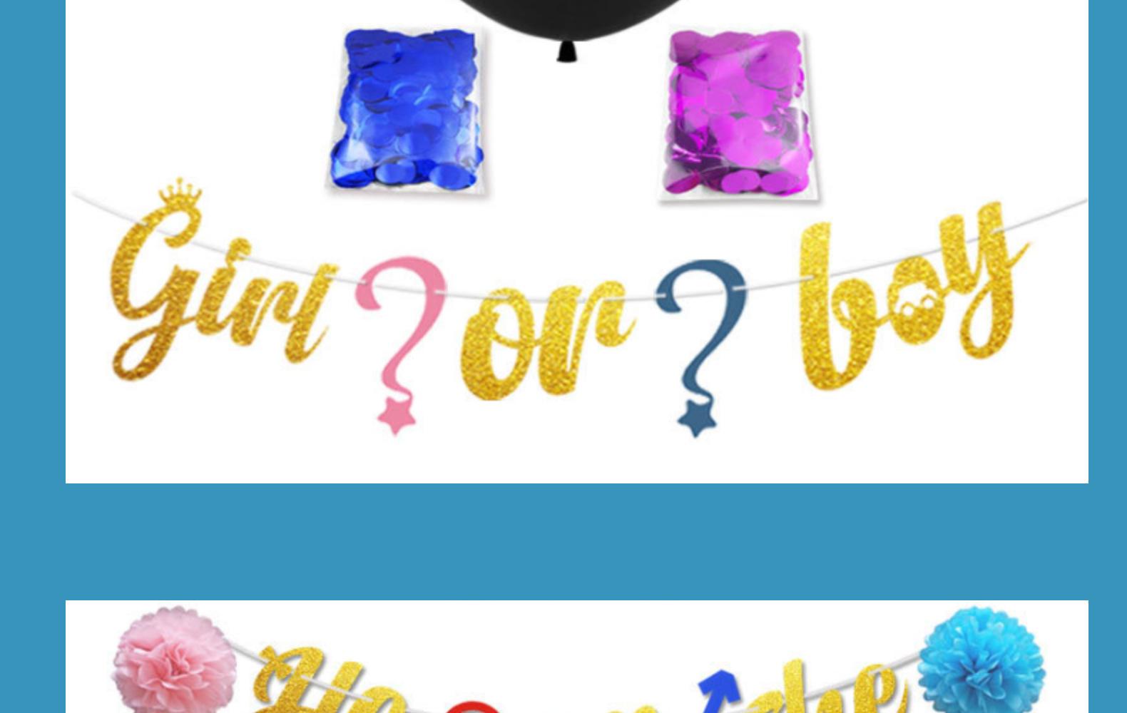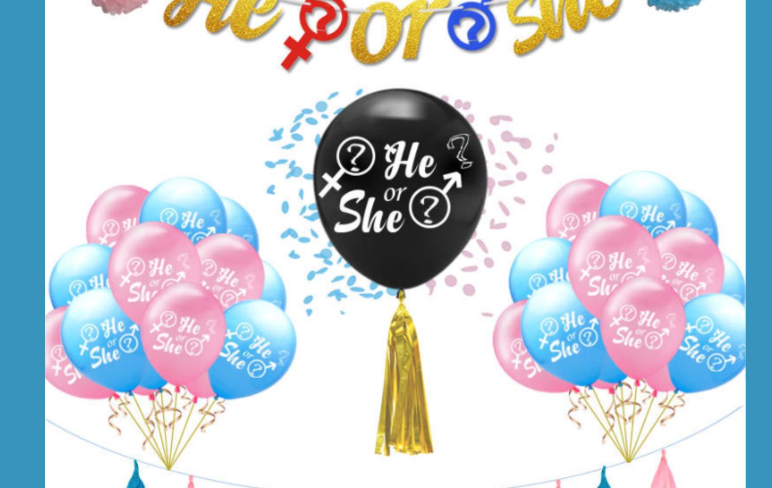 heorshe:1 36-inch H balloon +10 pink H balloon +10 blue H balloon +3 packs of 15 tassels +2 paper flowers + pull flag +2 sequins