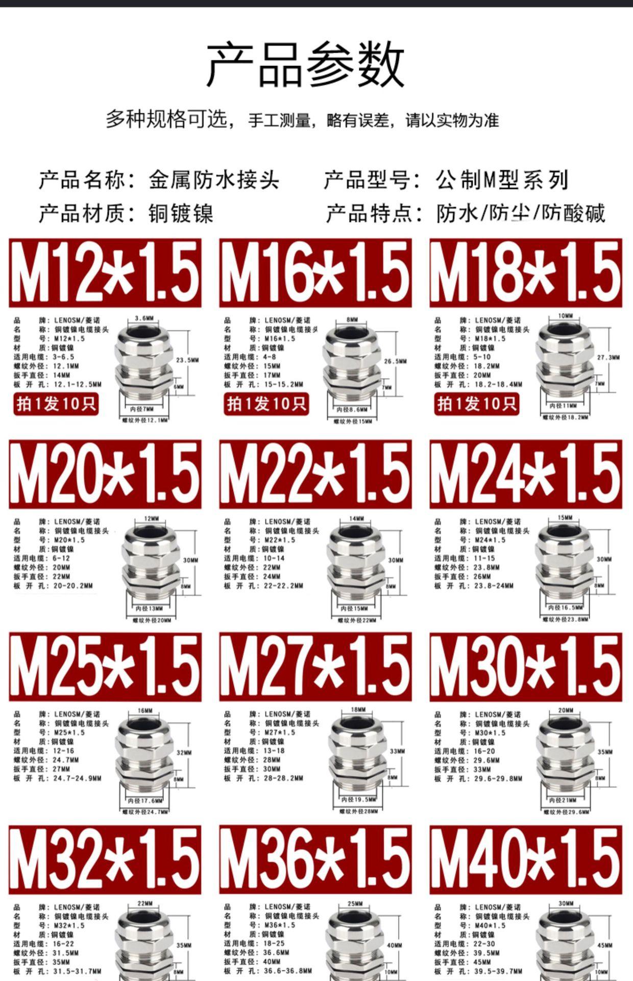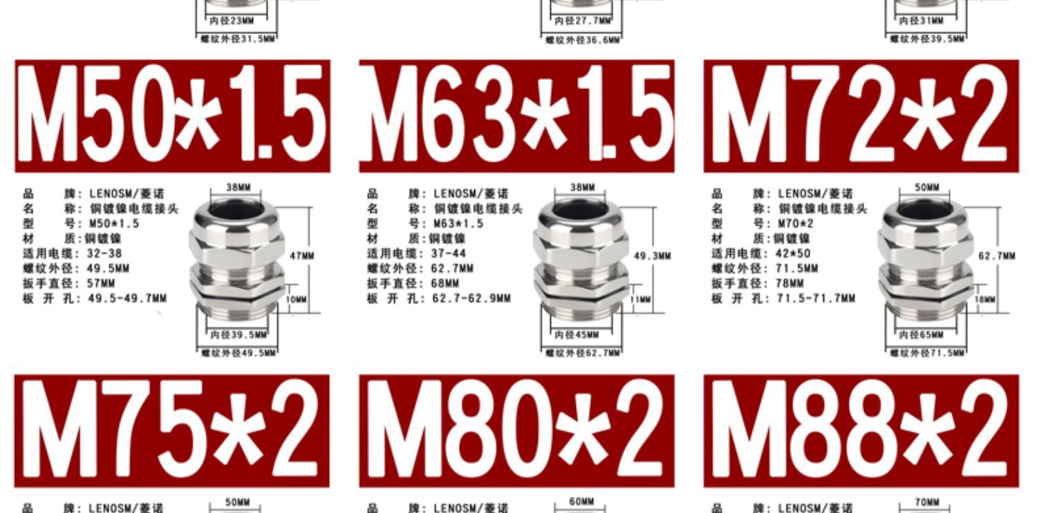 Nickel plated copper M12 × 1.5 (10 pieces), Nickel plated copper M16 × 1.5 (10), Nickel plated copper M18 × 1....