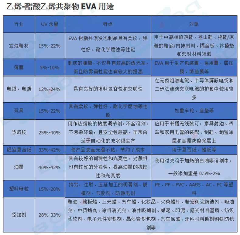 La resina EVA tiene una amplia gama de usos. En general, el EVA con un contenido de acetato de vinilo inferior al 5 % se utiliza principalmente para películas, cables, modificadores de LDPE, adhesivos, etc.; el EVA con un contenido de acetato de vinilo del 5 % al 10 % se utiliza para películas elásticas, etc.; el EVA con un contenido de acetato de vinilo del 20 % al 28 % se utiliza principalmente para adhesivos termofusibles y productos de recubrimiento; y el EVA con un contenido de acetato de vinilo del 5 % al 45 % se utiliza principalmente para películas (incluidas películas agrícolas) y láminas, moldeo por inyección, productos moldeados, productos de espuma, adhesivos termofusibles, etc.