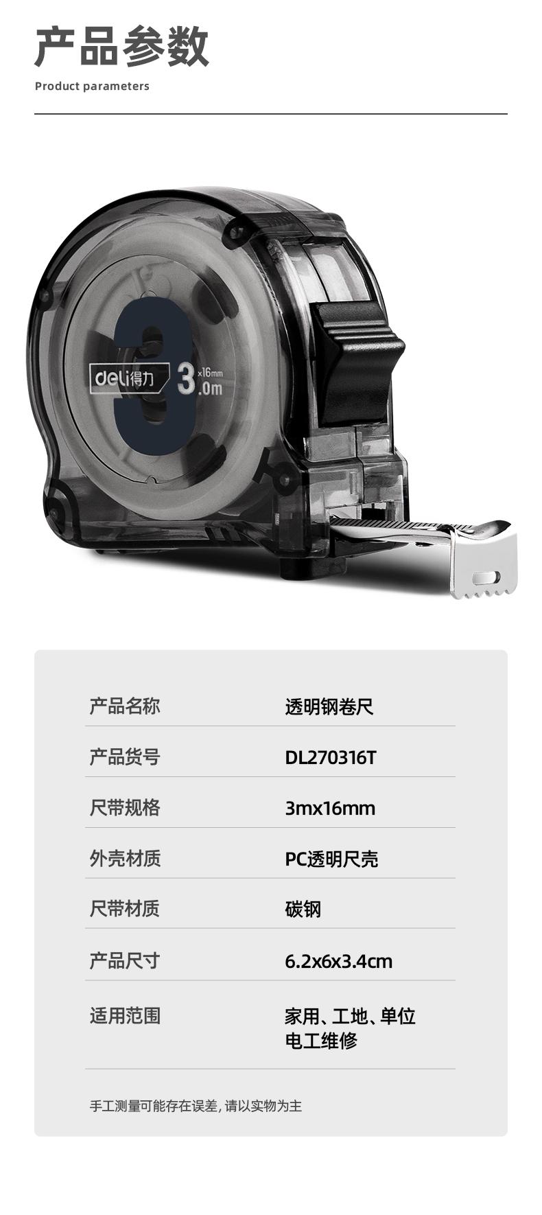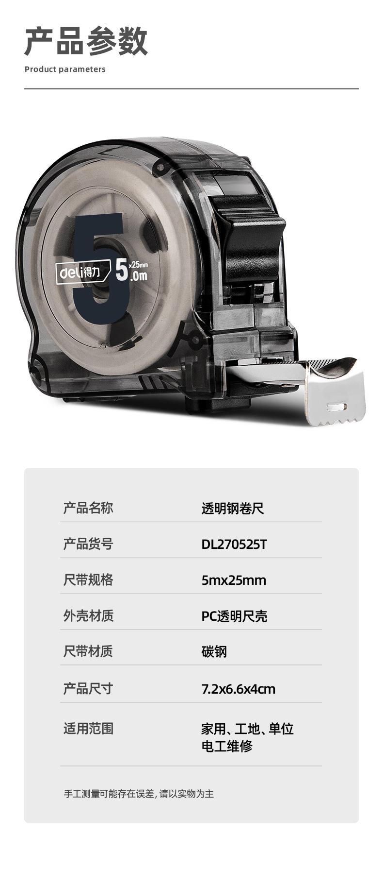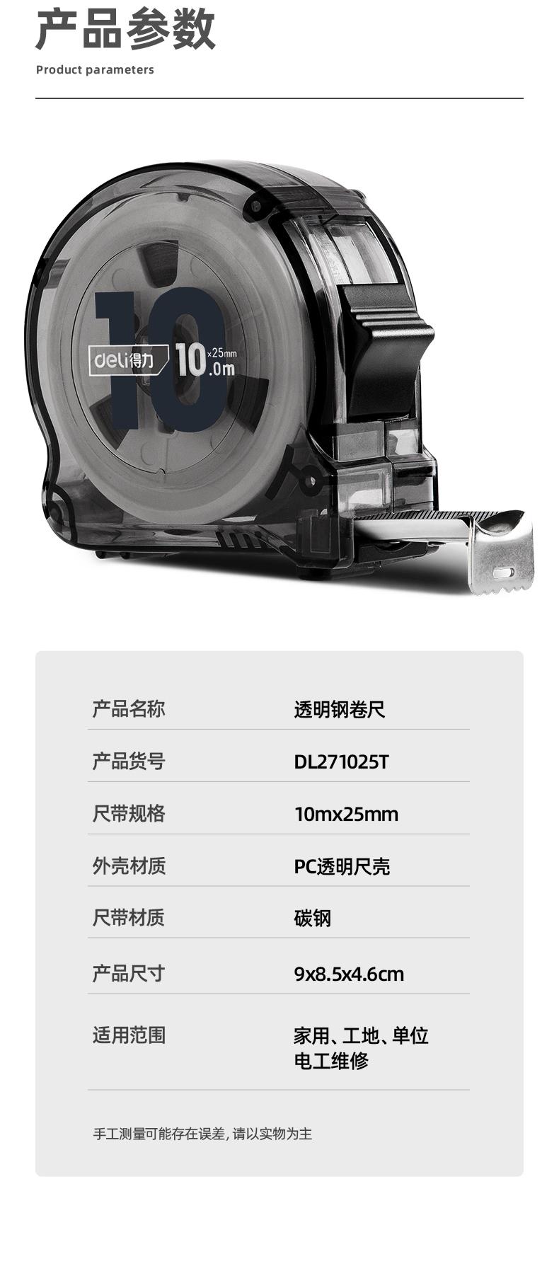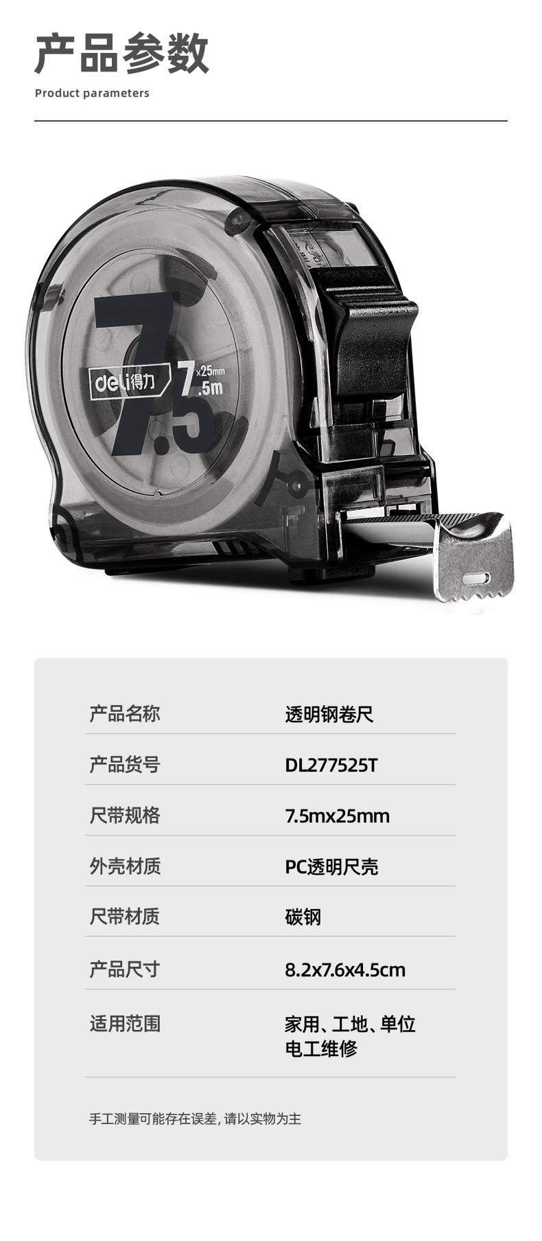 Cinta de acero Deli de acero inoxidable transparente engrosada dura anticaída caja regla 3/5 metros alta precisión 7,5/10 metros