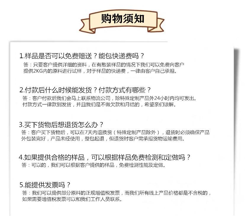 5. Todas las materias primas de nuestra empresa se devuelven incondicionalmente dentro de los 7 días. Las materias primas abiertas no son retornables. 6. Nuestra empresa proporciona las notas de entrega, recibos y propiedades físicas relevantes para todas las materias primas enviadas. Según las necesidades del cliente, también se proporcionan con la mercancía los COA, Rohs, MSDS, declaración ambiental, método de procesamiento, FDA, etc. relevantes.