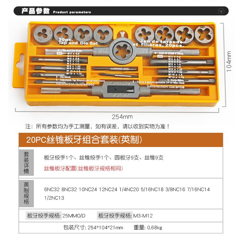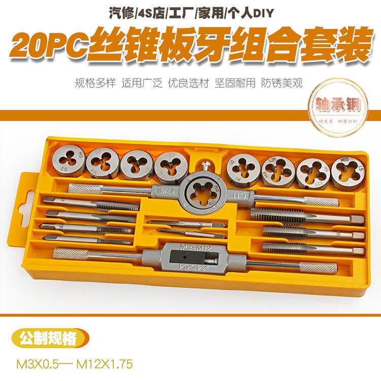 Juego de machos y terrajas métricas y en pulgadas de 20 piezas, llave de mano para machos, terraja de mano, juego combinado de machos métricos de mano