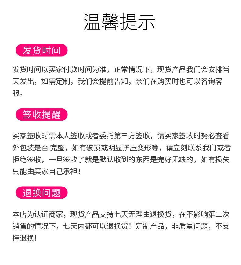 (Lea atentamente todo el contenido a continuación antes de comprar. Al tomar una foto, acepta y cumple con todos los términos de este acuerdo. Si no está de acuerdo, no compre). Si hay un problema de calidad, puede devolver o cambiar el producto. Si no hay problema de calidad, no puede devolverlo ni cambiarlo. 2. Tiempo de entrega: Los productos deben producirse sin stock, y el tiempo de producción depende del tamaño, la dificultad y la cantidad del producto. Una vez completada la producción y pagado el saldo, haremos todo lo posible para entregarle los productos de la mejor calidad lo antes posible. No prometemos el tiempo de transporte. Debido a días festivos, lluvia, nieve, niebla, etc., la logística y el transporte pueden retrasarse ocasionalmente, lo cual está fuera del control del vendedor. Por favor, comprenda. 3. Firme el recibo: Nuestros productos se envían tras una minuciosa inspección de calidad. Por favor, revise la mercancía en persona al recogerla. Para proteger sus derechos, revísela cuidadosamente antes de firmar la recepción. Si encuentra que la cantidad de piezas es incorrecta o que la mercancía está dañada durante el transporte, no firme la recepción y contáctenos a tiempo. La reenviaremos sin cargo alguno después de que la empresa de logística la devuelva. (Revísela cuidadosamente, especialmente si el embalaje exterior está desgastado o rayado; debe desembalarla y revisarla. Si no revisa cuidadosamente y firma la recepción directamente, la empresa de transporte se negará a compensar los daños causados durante el transporte, lo que le ocasionará pérdidas innecesarias). 4. Instrucciones de envío: El precio indicado en el producto no incluye impuestos ni flete. Debido a la distancia entre países, el flete también varía. 5. Instrucciones de pago: Puede usar Alipay. Si no es usuario de Alipay, puede transferir el dinero a través del banco. Antes de transferir el dinero, informe al propietario de los bienes comprados a tiempo a través de Wangwang, Qiuqiu, mensajes de texto del teléfono móvil, etc. Después de confirmar los bienes, el propietario informará el número de cuenta (Banco Industrial y Comercial de China, Banco Agrícola de China) por mensaje de texto. Después de la transferencia, elija el método anterior para informar al propietario de los detalles del pago para que el propietario pueda enviar los bienes a tiempo. |
