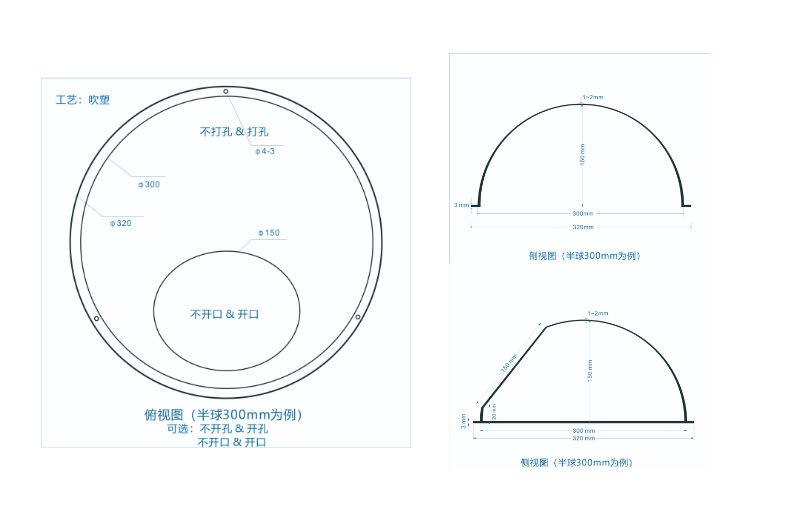 (3) Proceso del producto: dejar un margen de 1 cm, perforar 3\4 agujeros (diámetro 4 mm) en el borde o sin agujeros, la superficie esférica puede estar abierta o no.
