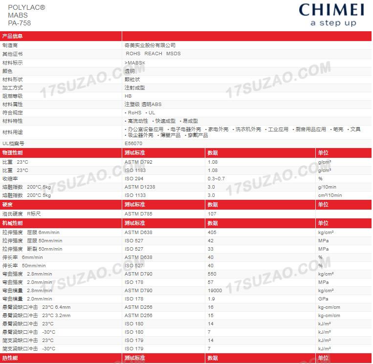 ABS Taiwán Chimei PA-758 carcasa de pantalla de alta transparencia, alto impacto, alta rigidez, cubierta de engranajes, materias primas de papelería