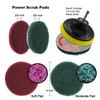 El juego de 10 piezas incluye: 1 pieza de cada una de las almohadillas abrasivas de 4 pulgadas verde, roja y gris, 1 pieza de cada una de las almohadillas abrasivas gruesas de 4 pulgadas roja, blanca y azul, 1 plato de plástico M6 de 4 pulgadas, 1 cabezal de cepillo azul de 2 pulgadas, 1 cabezal de cepillo azul de 3.5 pulgadas y un cabezal de cepillo azul de 4 pulgadas, con un peso neto de aproximadamente 344 gramos.