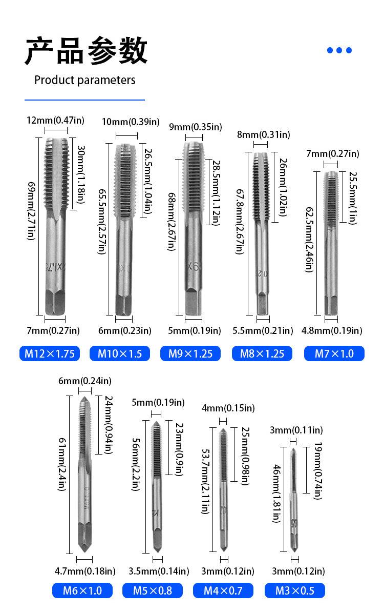 Generalmente se recomienda usar para materiales con una dureza inferior a 25 grados, como hierro fundido, plástico, etc. ¡Materiales como acero inoxidable y hierro templado tienen una dureza superior y este macho no se puede usar!
