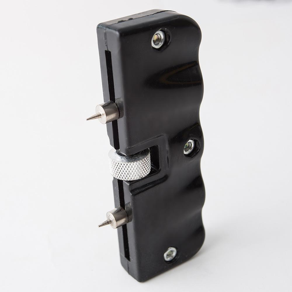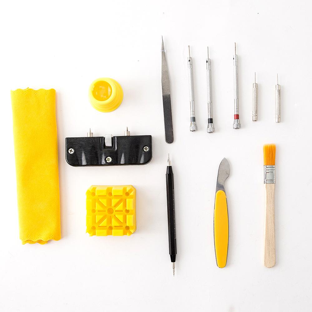 2 sacabocados de tornillo (0.9, 1.0), un par de pinzas de acero inoxidable, una gamuza amarilla para gafas, una lupa de reloj amarilla 10X, un abridor de tapa de mariposa negro (diámetro máximo de apertura del reloj es 75 mm), un tenedor de orejas negro de doble cabeza con escala, un cepillo pequeño para quitar el polvo, 20 juntas de drenaje de agua para reloj (diámetro 0.6 mm, tamaño 19-38).