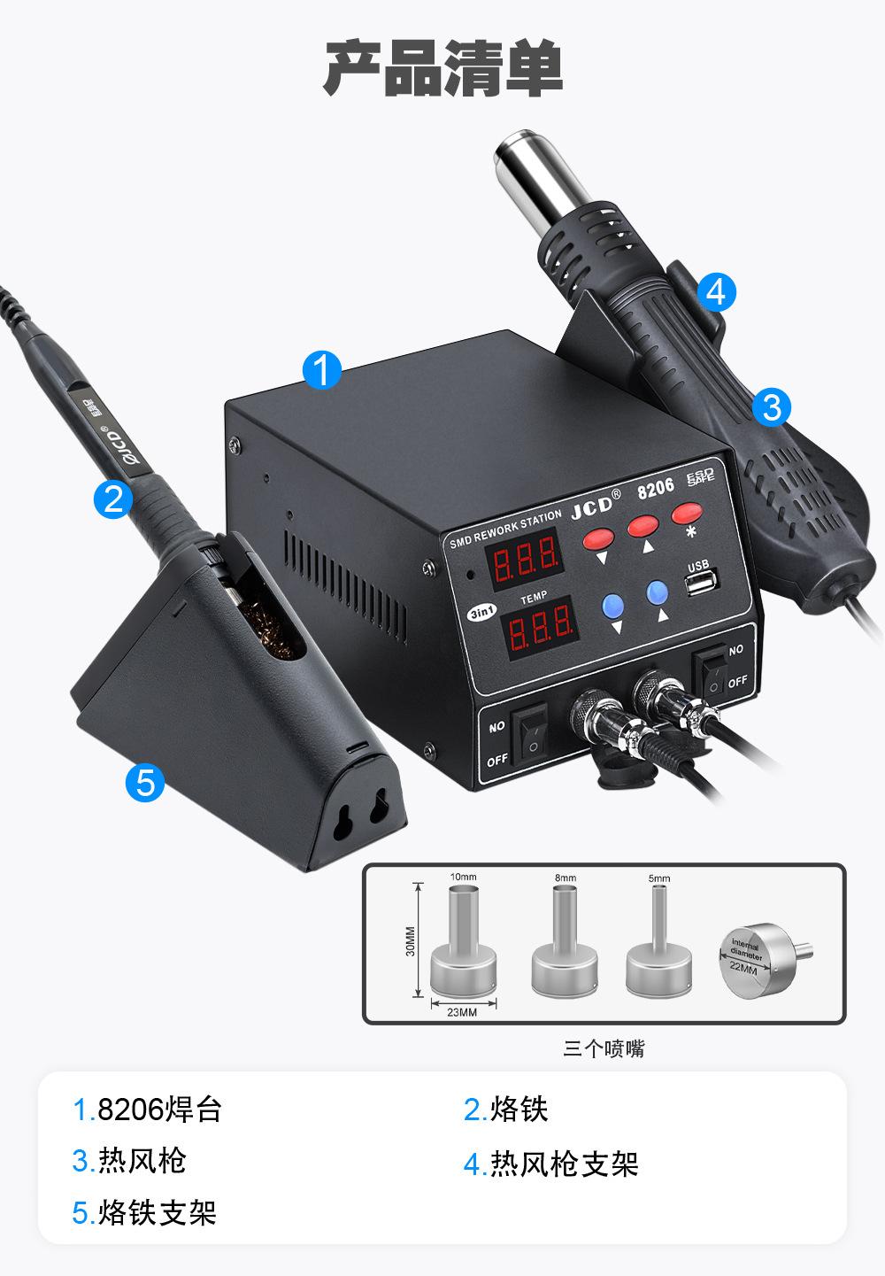 Estación de soldadura y retrabajo con pistola de aire caliente tres en uno JCD 8206, pantalla digital, temperatura ajustable, estaño de soldadura, soldador eléctrico, estación de desoldadura