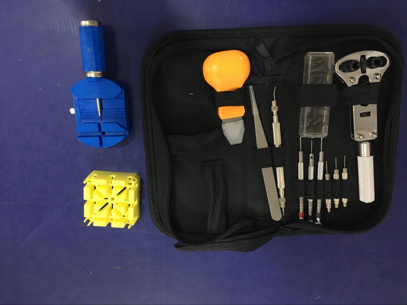 El juego incluye: un removedor de correas de reloj con una plataforma elevadora, un cuchillo para palanquear el fondo, un abridor de tapas de reloj, un destornillador con resorte con una cabeza extraíble, un par de pinzas de acero inoxidable, un abridor de tapas de reloj de tres garras, una caja de dientes de acero de tres garras para abrir, tres destornilladores planos (los tamaños son 1.0, 1.2, 1.4 y 1.6 mm, tres se asignan aleatoriamente), tres punzones de acero para correas (0.8, 0.9 y 1.0 mm)