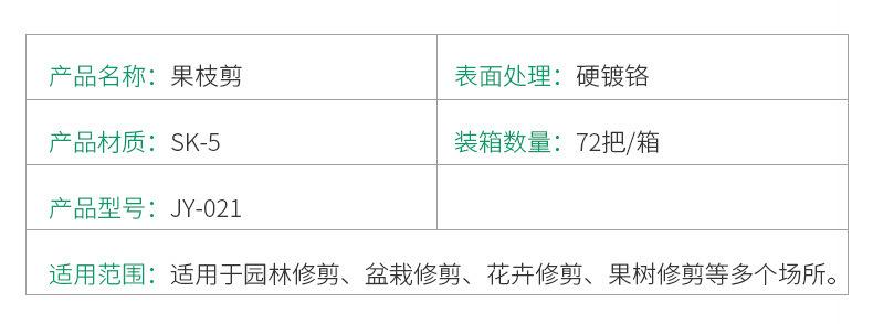 Tijeras Jianyu del distrito de HedongLos principales productos de la fábrica incluyen tijeras de podar, tijeras para ramas frutales, tijeras para raleo de frutales, tijeras de podar, tijeras de podar, tijeras de ramas altas y otras herramientas de jardinería. La fábrica cuenta con un sistema de gestión de calidad completo y científico.La integridad, la resistencia y la calidad de los productos de Tijeras Jianyu del Distrito Hedong han sido elogiadas por la industria. Invitamos a amigos de todos los ámbitos a visitarnos, guiarnos y negociar.