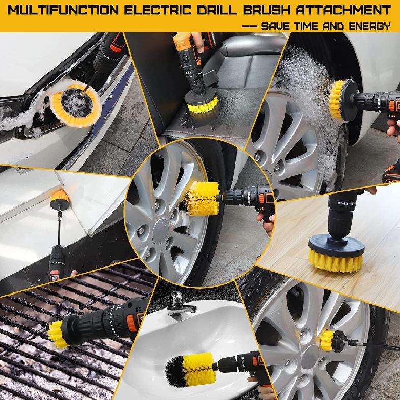 Este juego de 7 piezas no incluye un taladro eléctrico, la cotización incluye, 1 cabezal de cepillo de 2 pulgadas, 1 cabezal de cepillo de 2.5 pulgadas, 1 cabezal de cepillo extendido de 3.5 pulgadas, 1 cabezal de cepillo de 4 pulgadas, 1 cepillo para ranuras, una varilla de extensión de 15 cm, una combinación de juego