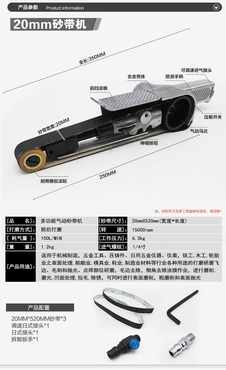 20mm pneumatic belt sander (with speed control), 20mm pneumatic belt sander (without speed regulation)