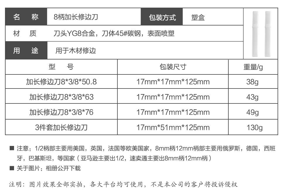 Lengthened trimming knife 8*3/8*50.8, Elongated trimming knife 8*3/8*63, Lengthened trimming knife 8*3/8*76, 3...