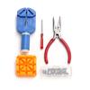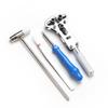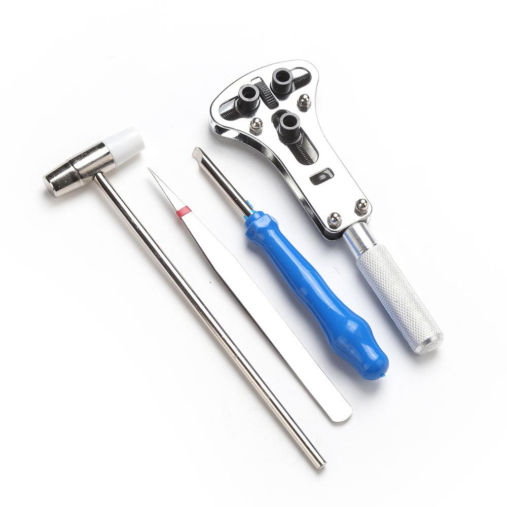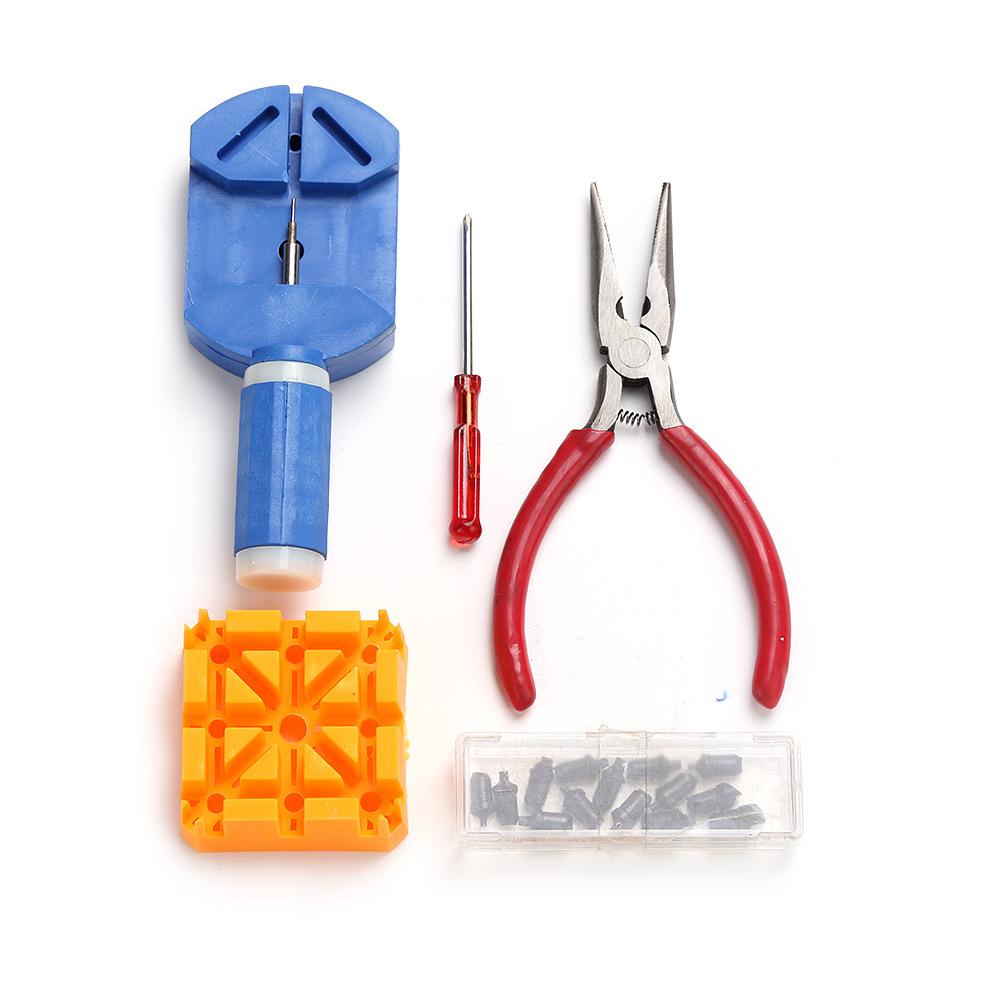 El juego incluye: un extractor de correas de reloj, un zócalo Pozidriv amarillo, un abridor de tapa de tres garras, un par de pinzas de acero inoxidable, tres destornilladores de punta plana (los tamaños son 1,0, 1,2 y 1,4 mm), tres punzones de correa de acero (0,8, 0,9 y 1,0 mm), un martillo de metal de doble propósito, una horquilla de oreja de doble cabeza, un par de alicates rojos, un destornillador de cruz negro, un destornillador de cruz rojo, una palanca inferior azul, una caja de 18 cabezas para el abridor de tapa de tres garras。