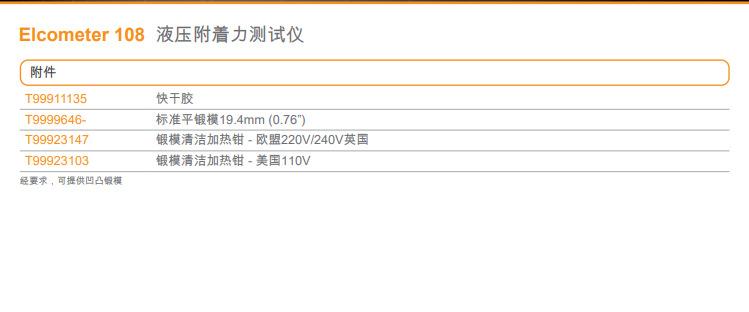 | Lista de embalaje | Elcometer 108, estuche de transporte ABS, 5 sufrideras planas, 5 tapones de nailon, adhesivo de secado rápido MC1500, Herramientas de limpieza de Dolly, pinzas de calentamiento |