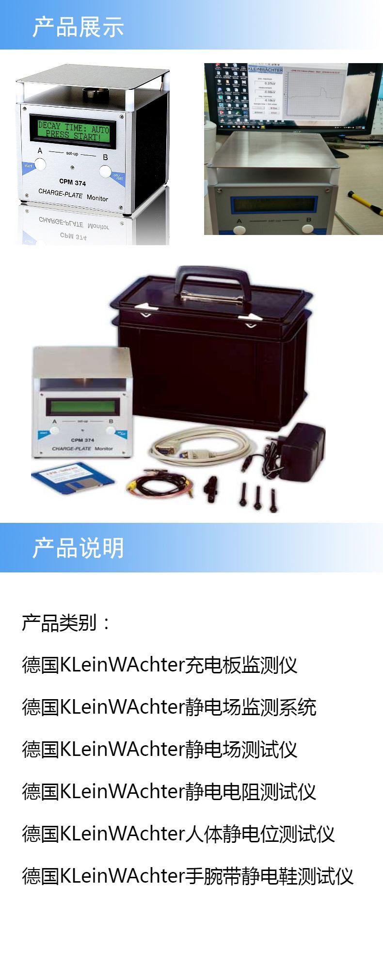 Monitor de placa de carga CPM374, compuesto por temporizador integrado, generador de alto voltaje y sensor de campo eléctrico. Con su propio electrodo plano y diseño de alta impedancia de 1015 Ω, permite detectar el potencial estático, el tiempo de decaimiento estático y el balance iónico del eliminador de estática, así como el tiempo de decaimiento estático de los materiales.