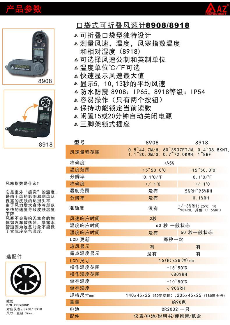 Anemómetro plegable de bolsillo dos en uno Hengxin AZ8908, medidor digital de velocidad del viento y temperatura de alta precisión.